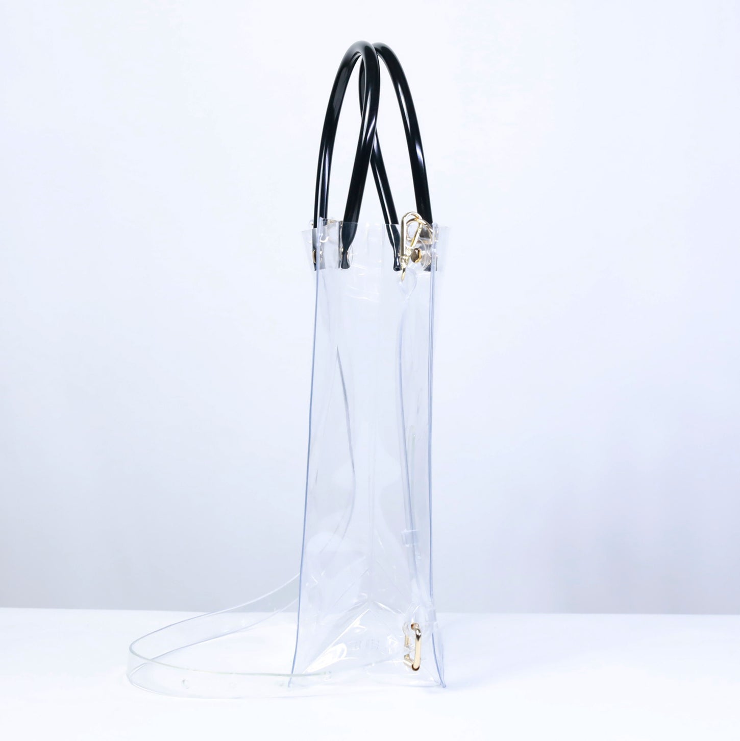 透明感のあるPVC素材が、軽やかさと強度を兼ね備えた構造美を実現。横から見たときにも、クリアな質感と直線的なフォルムが際立ち、モダンで都会的な印象を引き立てます。PVCならではのハリ感がシルエットにメリハリを生み、どの角度から見てもスタイリッシュな存在感を放つ仕上がりです。
