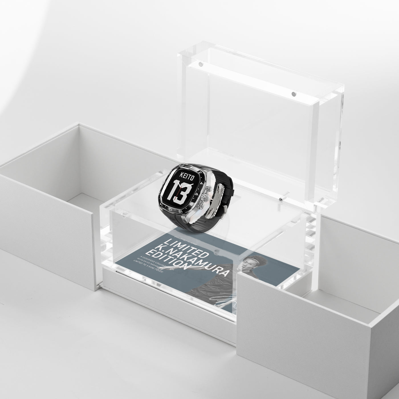 製品は今回のコラボレーションモデルのためにデザインされた特別仕様のクリアBOXに収められます。そして、BOX底には「中村 敬斗」選手のビジュアルがデザインされたボードがセットされたファン必見のこだわりの特別仕様となっています。