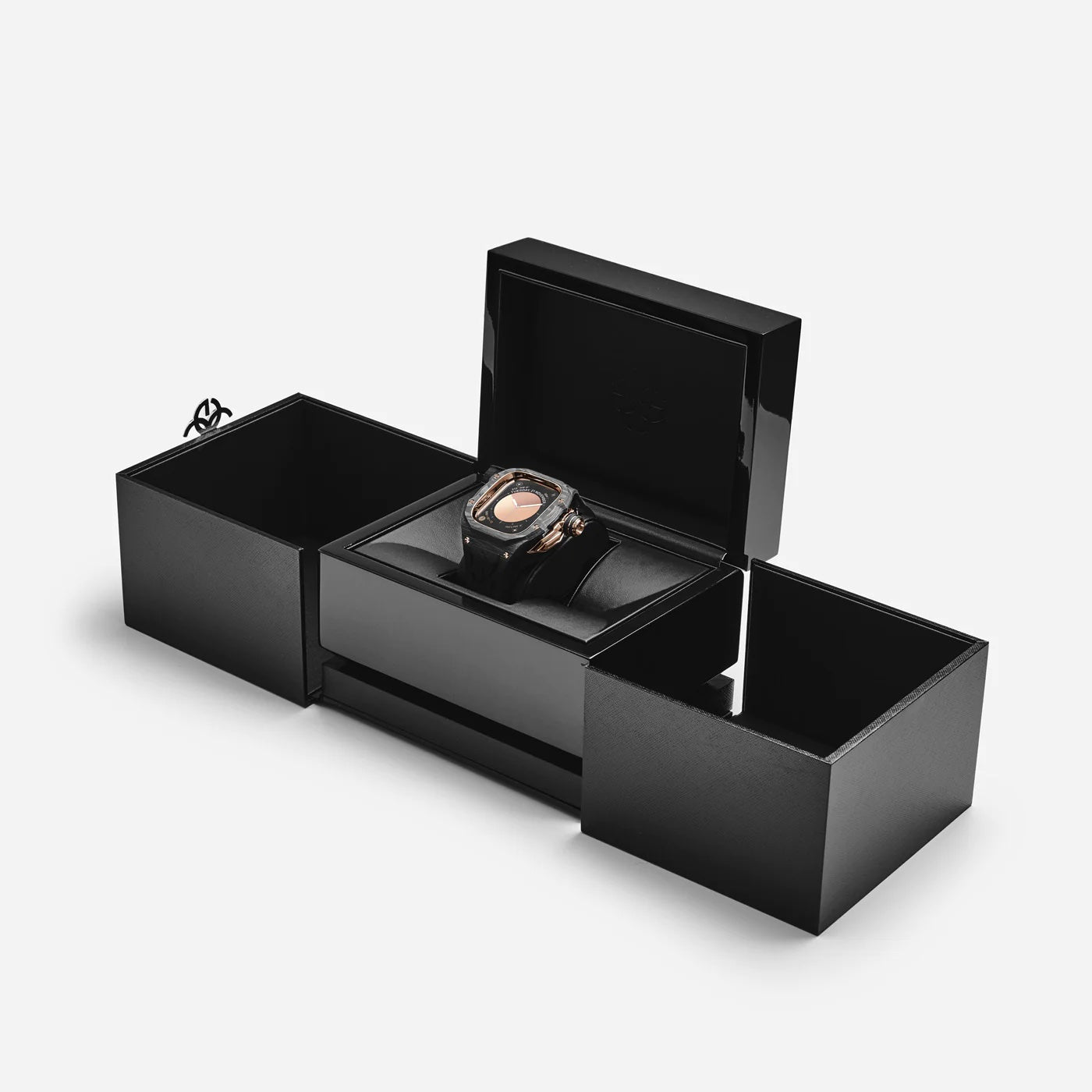 全体を覆うように装着されるケースは、一目ではアップルウォッチと分からない非常に特徴的な外観を持っています。またバックケースは円形状にくり抜かれており、ケースを装着したままでの充電が可能です。操作性を損なうことなく、外観をアップグレードする為に、ケースをより複雑な機構にする必要がありました。アップルウォッチ側面のデジタルクラウンとプッシュボタンに連動するシステムは、ゴールデンコンセプト特有の技術です。