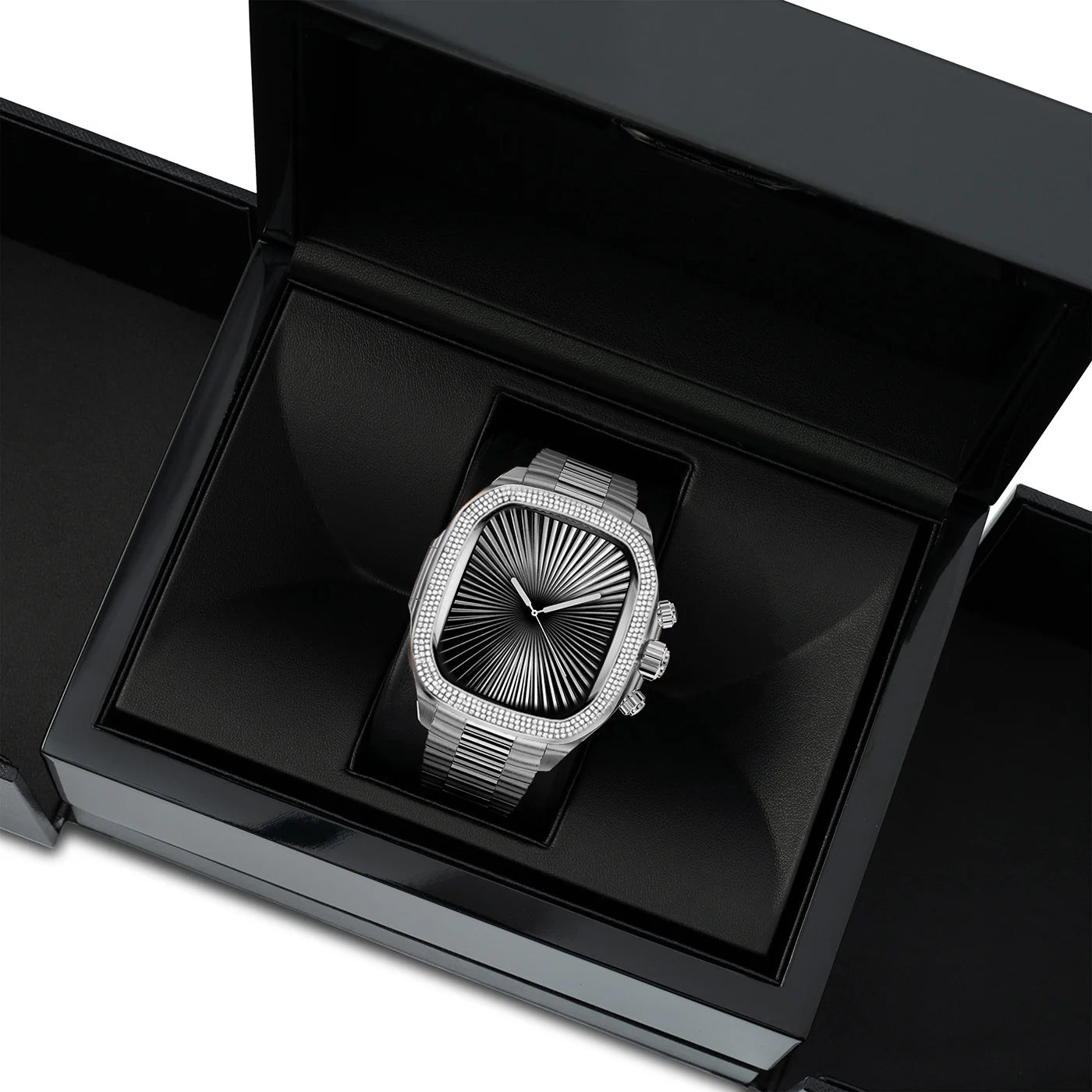 ラボグロウンダイヤモンド をあしらった特別なモデルは、高級時計を思わせる風格を湛えながら、ラグジュアリーな輝きを纏ったデザインに仕上げられています。洗練されたディテールと気品ある煌めきが、ビジネスから華やかなシーンまで、どんな場面でもエレガントで印象的な存在感を放ちます。