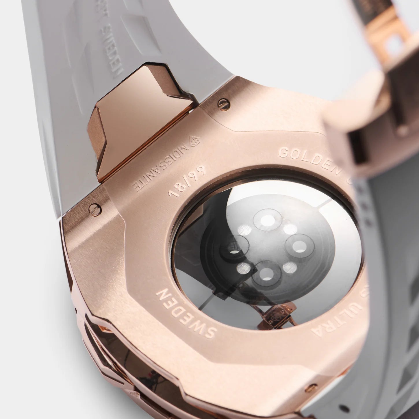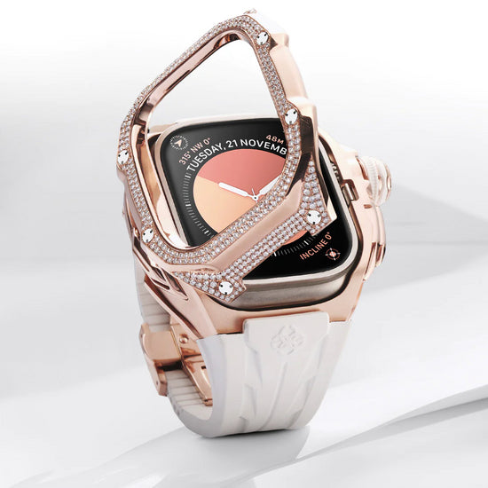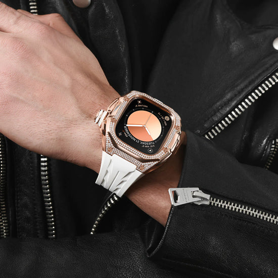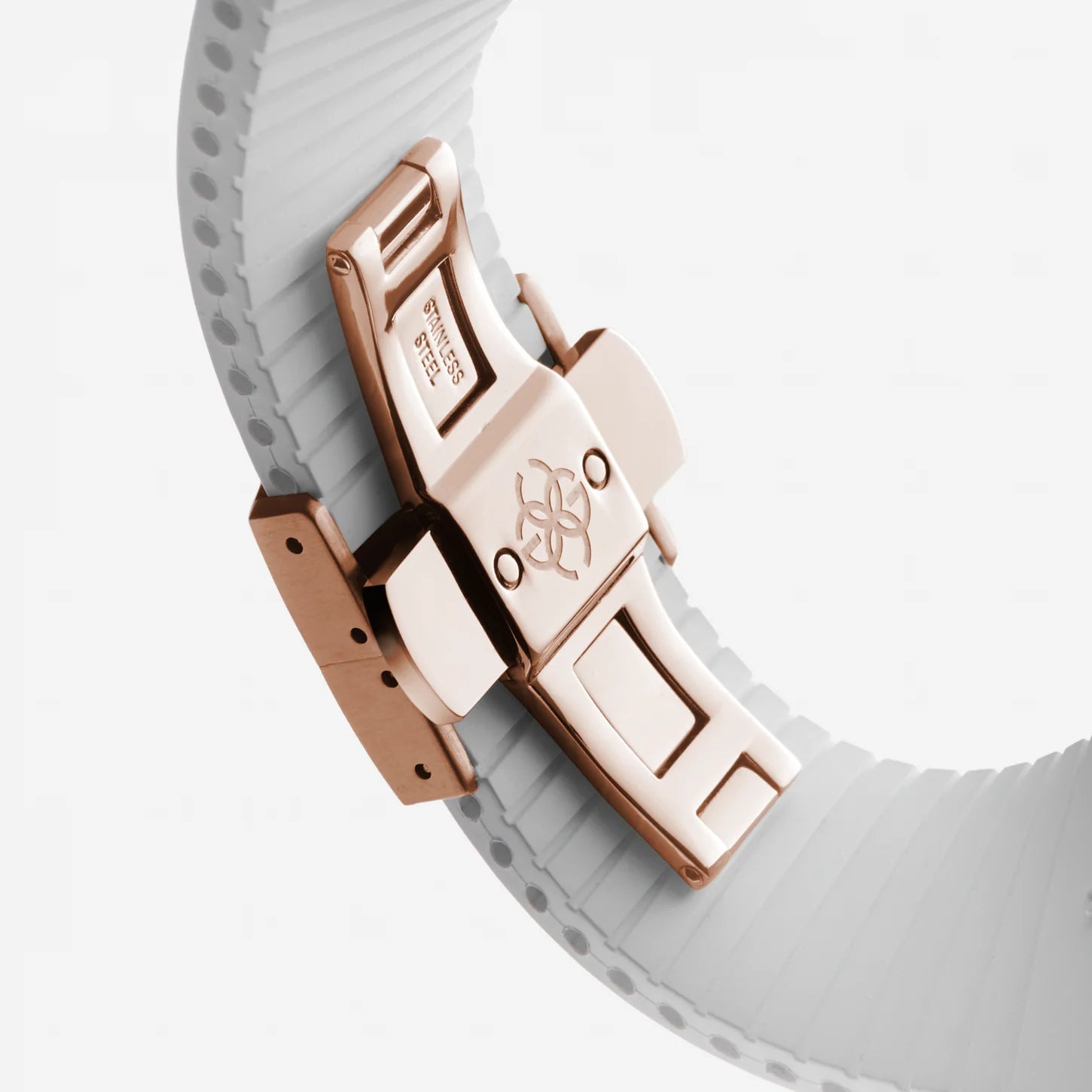 肌馴染みの良いローズゴールドケースに、ホワイトストラップの上品で洗練されたデザイン。モアサナイトの輝きがケースを飾り、優美さをより引き立てます。手元を華やかに彩り、日常使いから特別なシーンまで幅広くお使いいただけます。