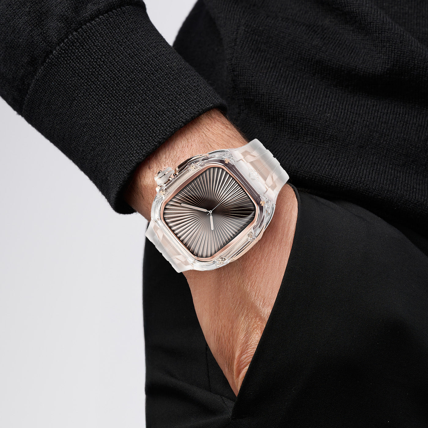 透明なナイロン素材を採用し、ウォッチとケース内部の構造が透けて見えるデザイン。精巧にカットされた表面が光をとらえて反射し、奥行きと透明感のある美しい輝きを生み出します。ステンレススチールのディテールと調和し、どの角度から見ても洗練された印象に。