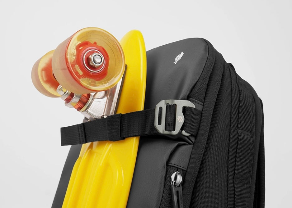 アウトドアシーンに最適な本モデルは、フロントとショルダーに備えられたフックストラップでスキーやスノーボードなどをしっかり固定できます。