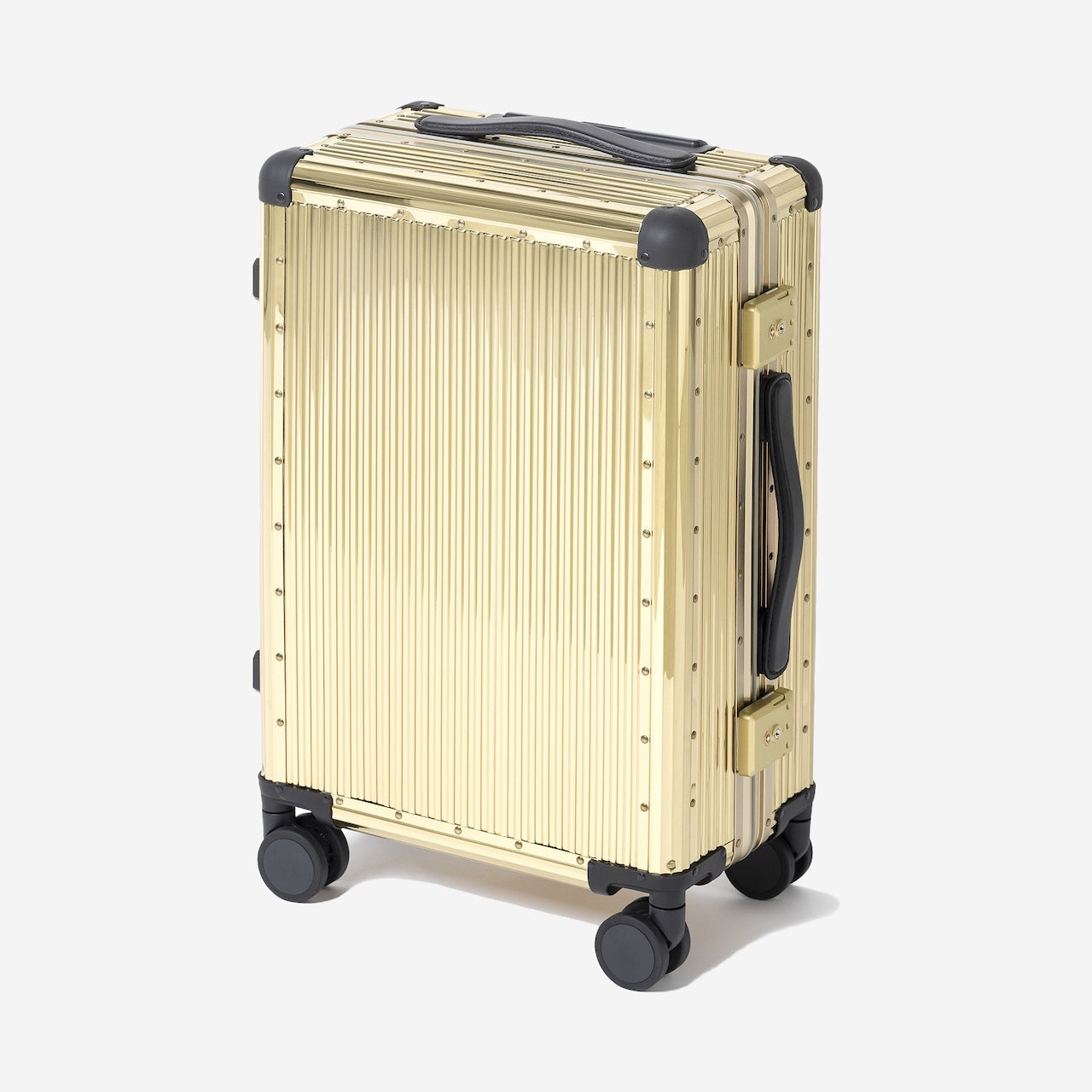 シャンパンゴールドは上品で落ち着いた輝きを持つカラーリング。何度もサンプルを重ね、光の反射や質感、トーンまで徹底的に追求しました。ハンドルには上質なブラックレザーを、角部分には衝撃を和らげる黒いラバーパーツを配し、黒と金の洗練されたコントラストが上品な印象を演出しています。