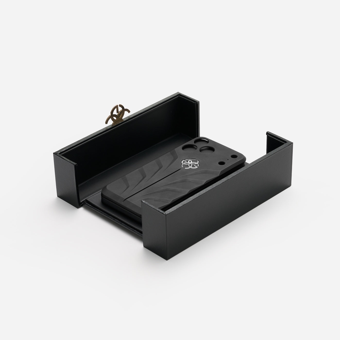 製品は、内装にブラックレザーを用いたハンドメイドのブラックオーク製ボックスに収められます。商品の魅力を最大限に引き出すために、開封構造にも工夫を凝らし、慎重にデザインしました。単なる包装物に留まらず、贅沢で魅力的な"開封体験"をお届けします。