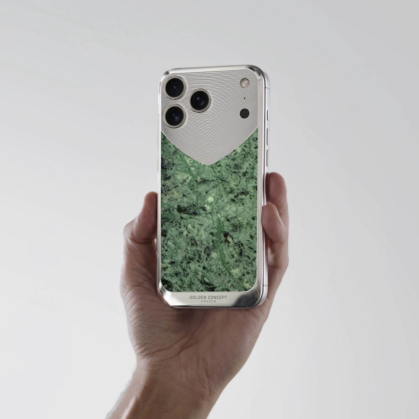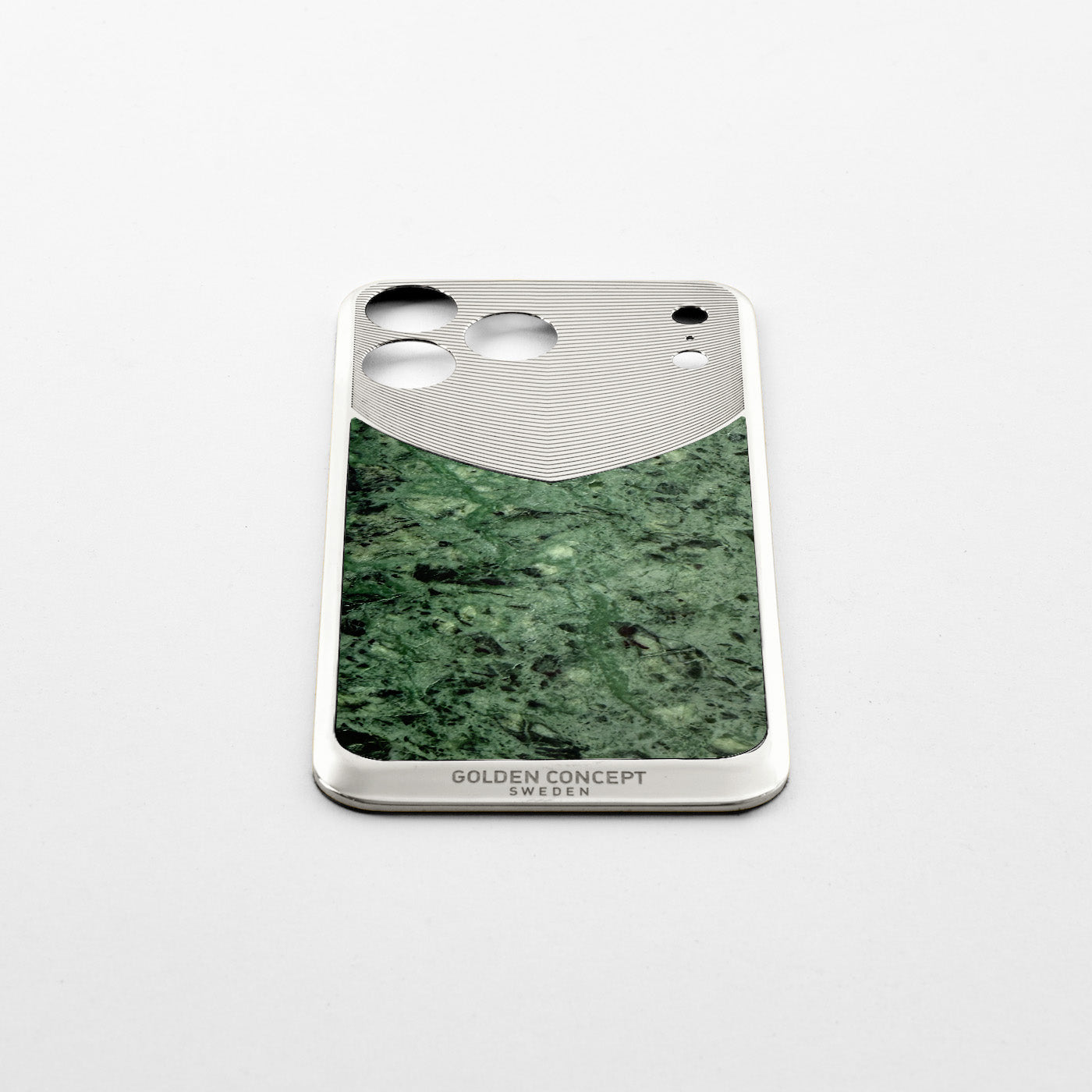 シルバートーンのスチールフレームには控えめな刻線が施され、目線を大理石のインレイへと誘います。素材の持つ自然な美しさと精緻なディテールとのバランスを際立たせ、石とスチールが一体となって iPhone のスリムなフォルムを保ちつつ、さりげなく洗練された存在感を演出します。