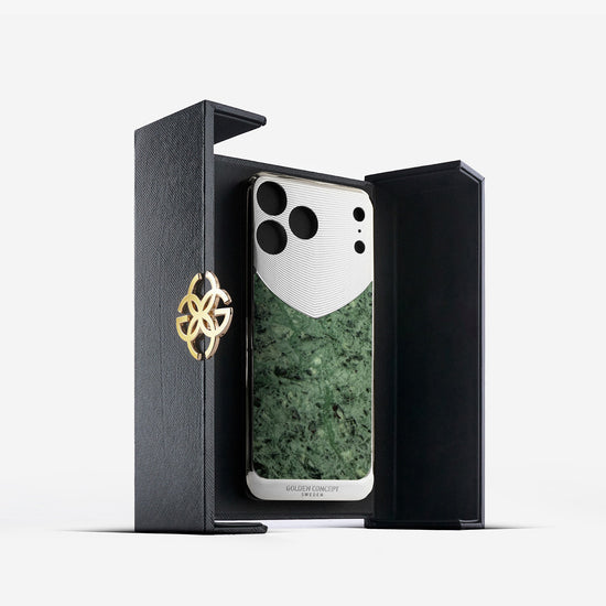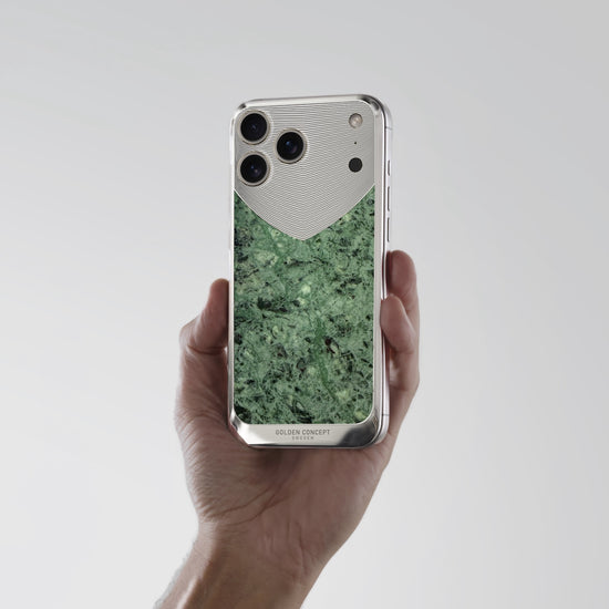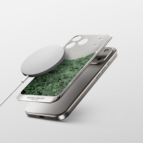 iPhone 17 Pro、Pro Max、Air 用に仕立てられた「Verde Issorie マグネティックシールド」は、柔らかなグリーンの色合いと淡く有機的な模様が特徴の天然大理石を使用しています。ポリッシュ仕上げのステンレススチール製バックプレートに美しくはめ込まれ、石の穏やかな深みと精密な設計が調和したデザインです。