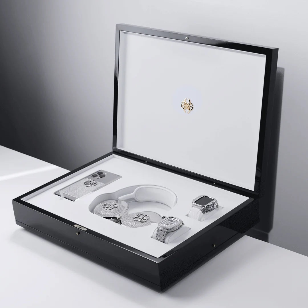 本コレクションは内装にホワイトレザーを用いたハンドメイドのブラックオーク製ボックスに収められます。ボックスは購入者の好みに合わせてカスタマイズすることも可能。最高級のラグジュアリーガジェットに相応しいオーラを放ちます。