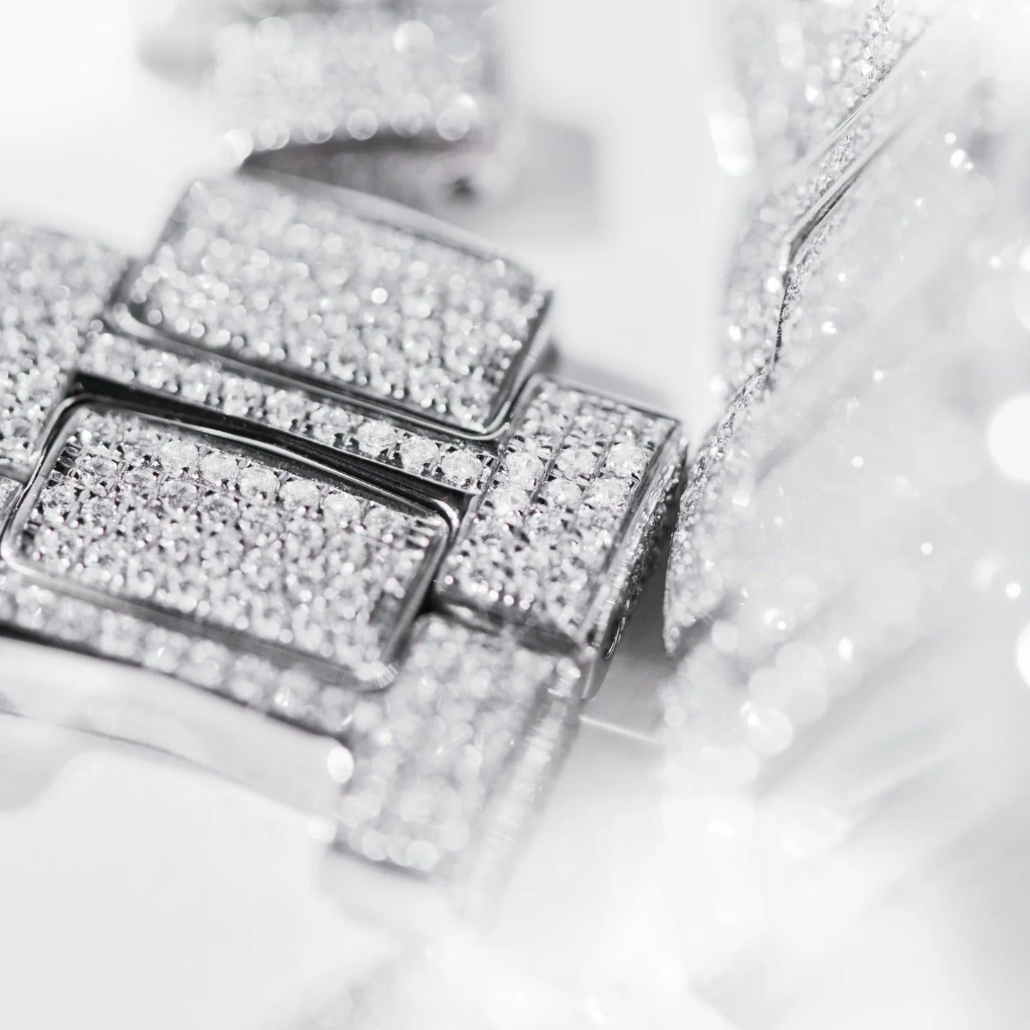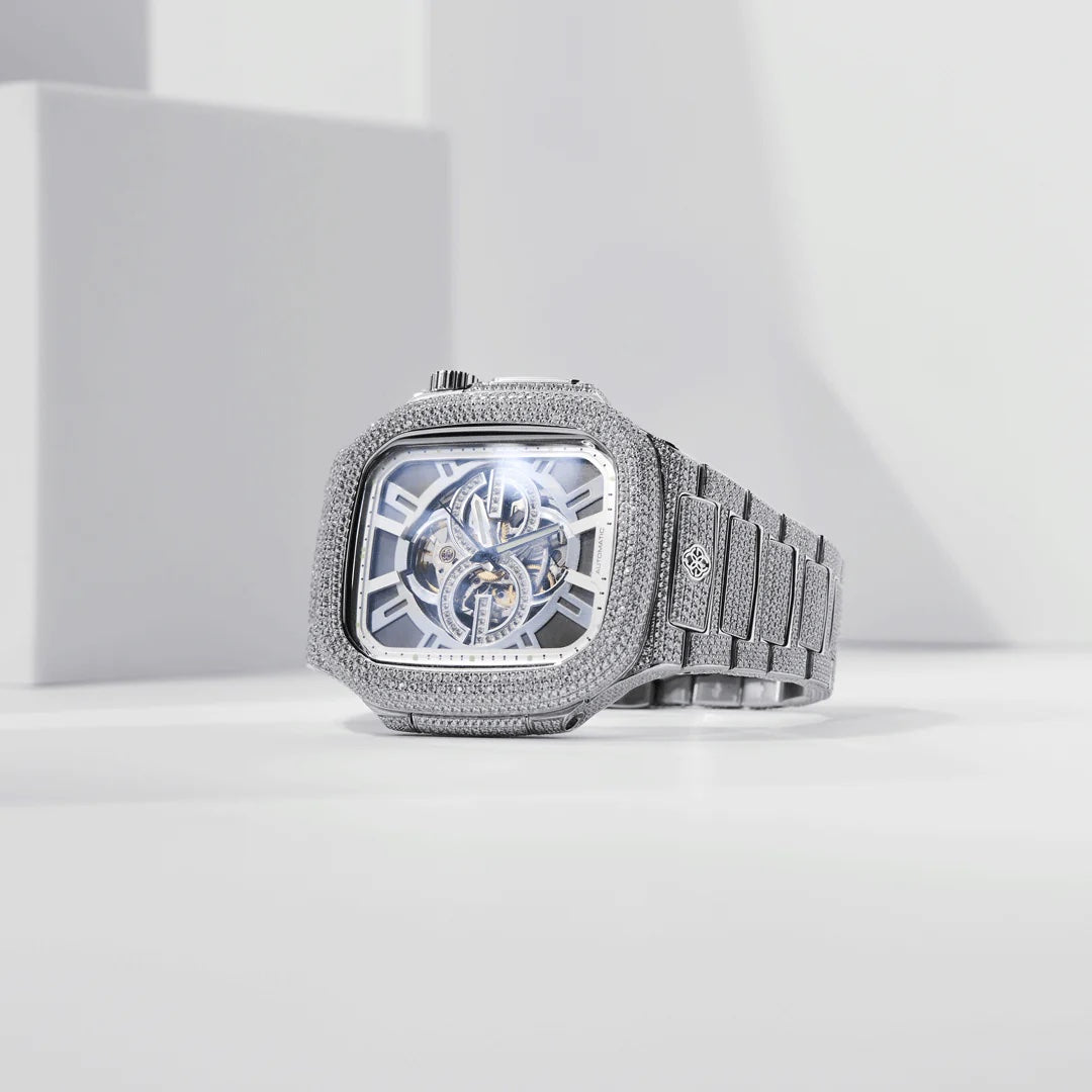 Apple Watchケース『ロイヤルアイスエディション』は、計27.59カラット、3,066個のダイヤモンドを173時間かけて手作業でセッティング。ハッチベゼルデザインによりApple Watchを簡単に交換することも可能です。さらに、高級感と機能性を高めるスイスの自動巻き時計も付属。
