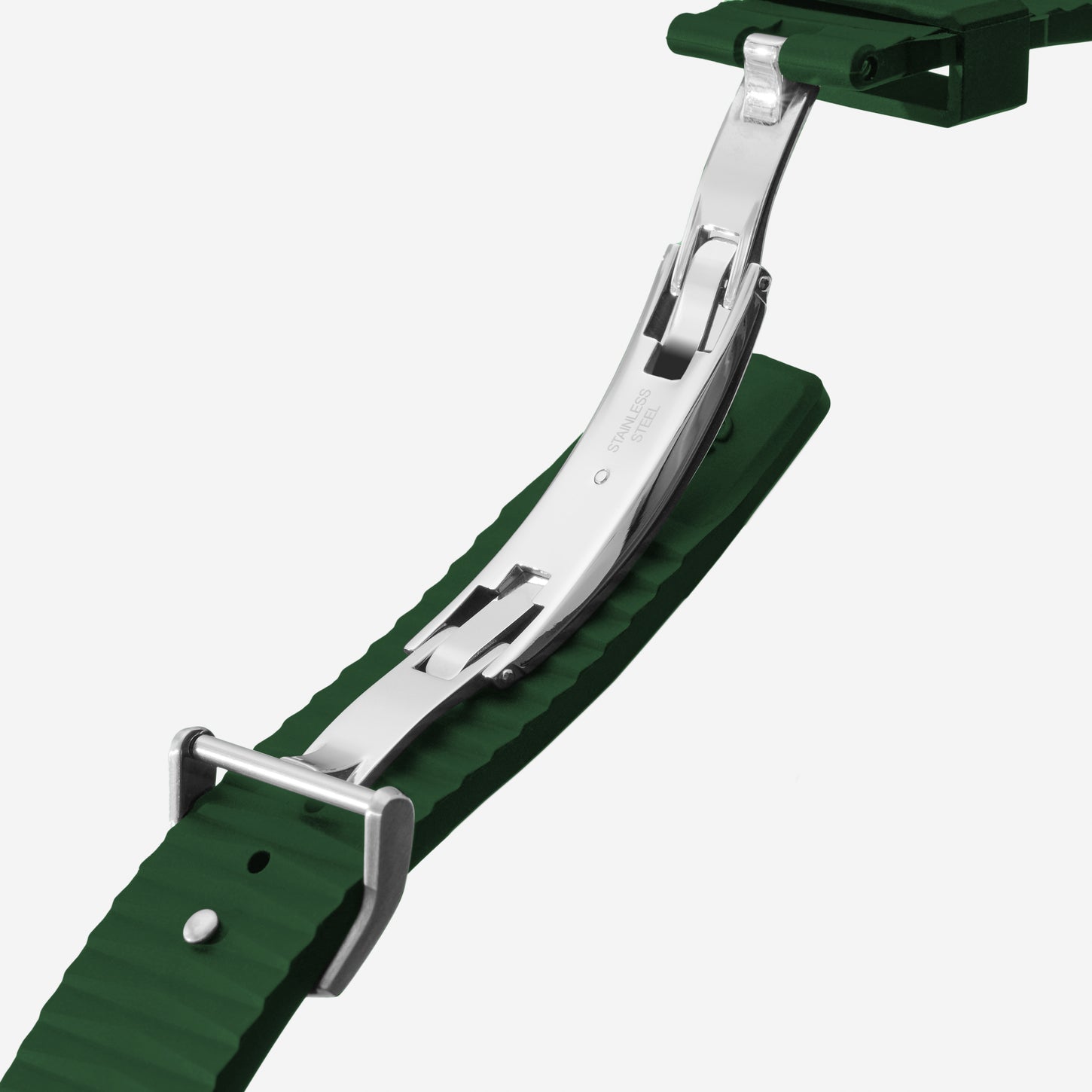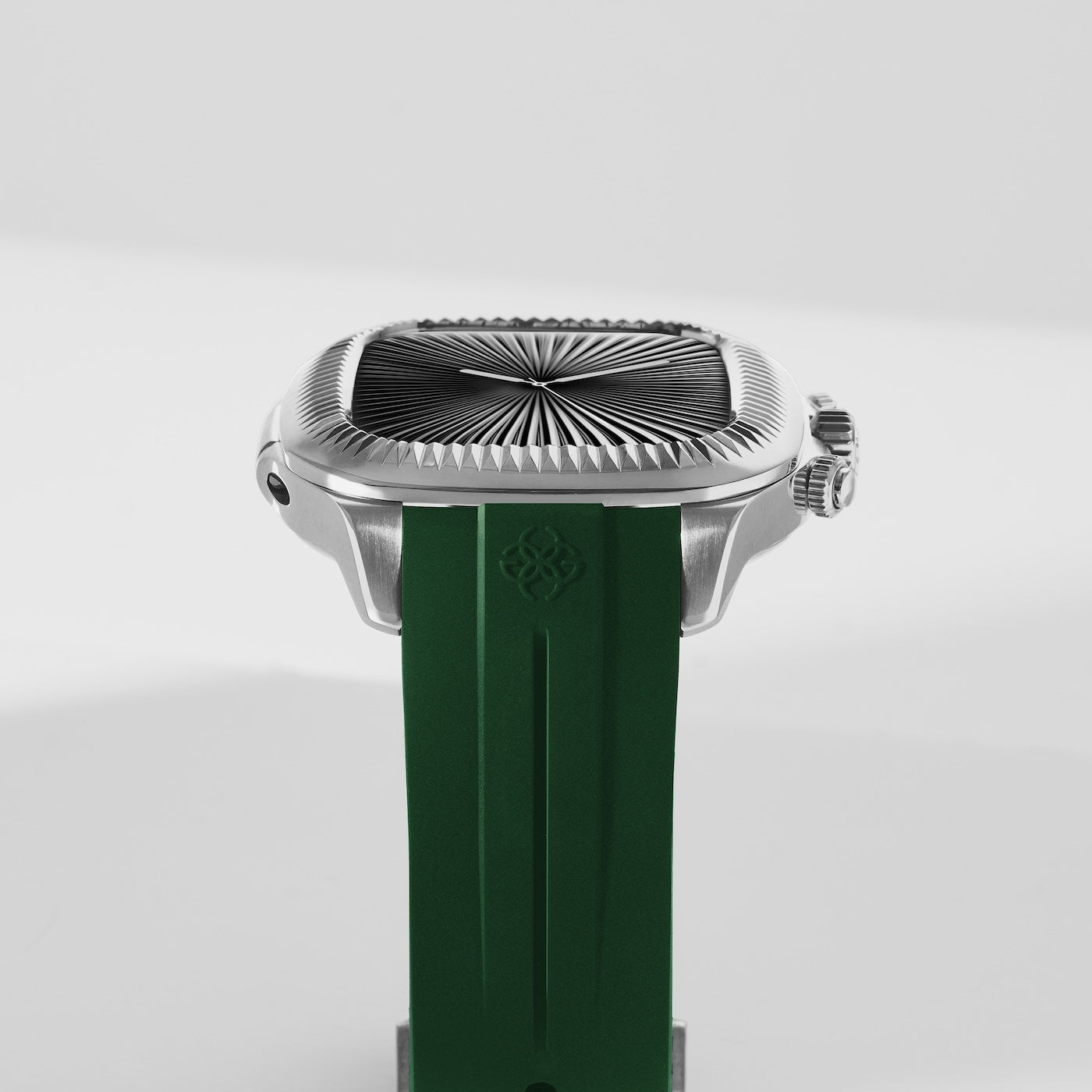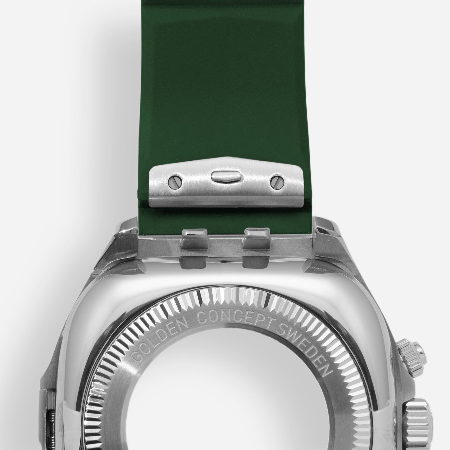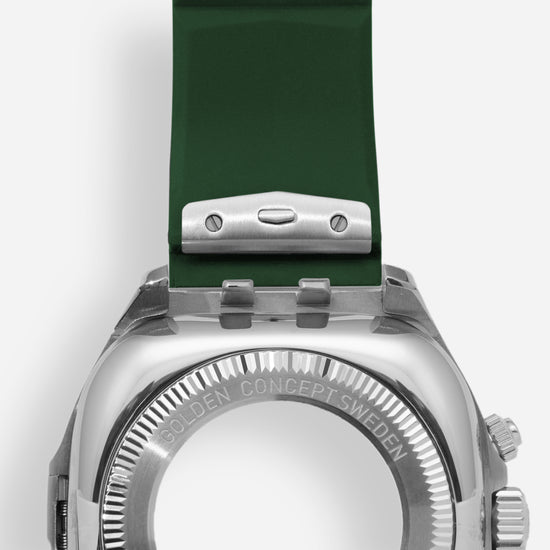 しなやかさと強さを兼ね備えたフルオロエラストマー製のストラップは、手首に自然に馴染み、熱や湿気、日常の使用にも耐えながら快適さを持続します。バタフライバックルが安定したフィット感を生み出し、立体的にデザインされたGCエンブレムが上品なアクセントに。仕上げはポリッシュシルバーのほか、PVD加工を施した18Kゴールドやローズゴールドをご用意し、クラウンエディションケースに美しく調和します。