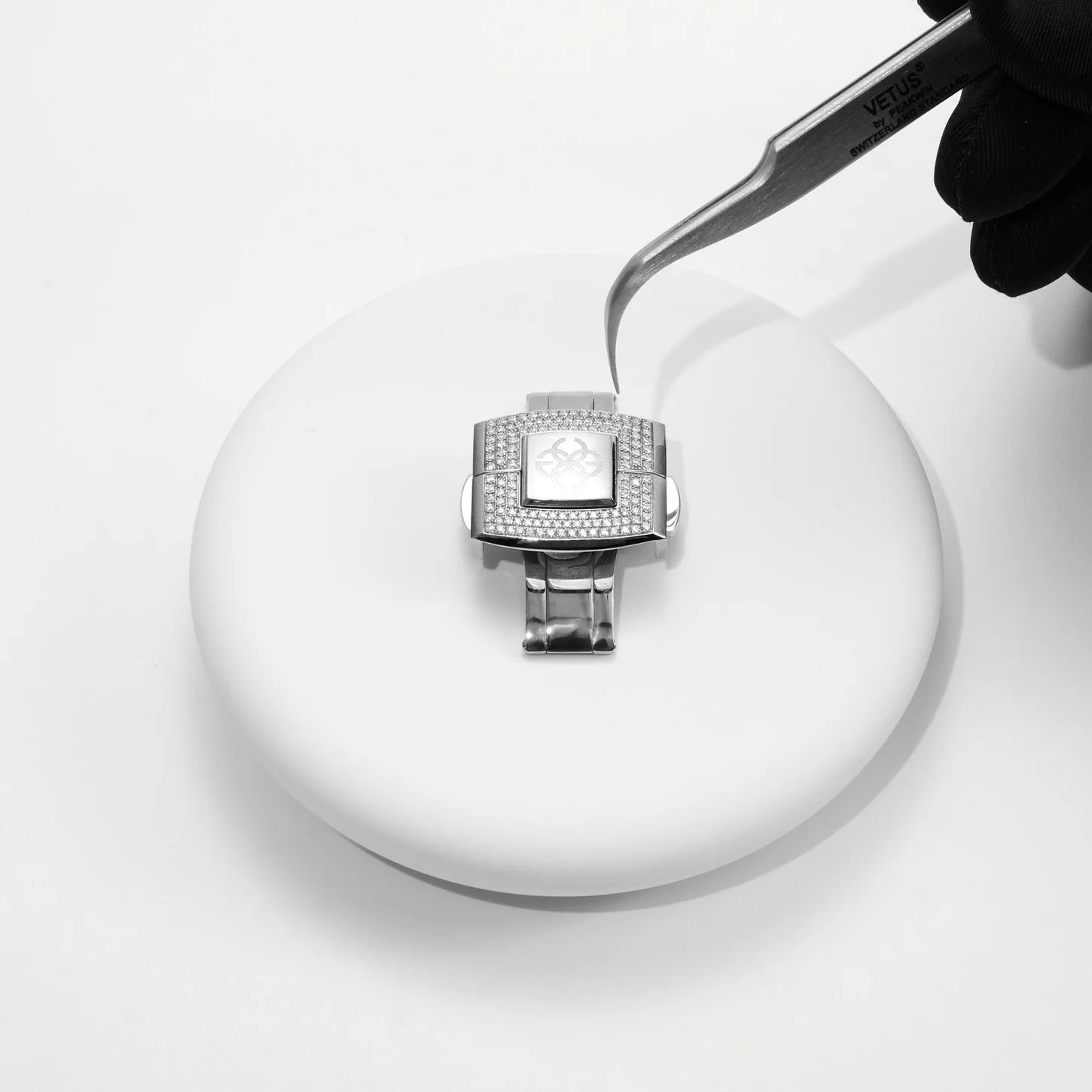 138個のVVSダイヤモンドをセットしたバタフライバックルは、手首にしっくりとフィットし、贅沢さと快適さを同時に提供します。