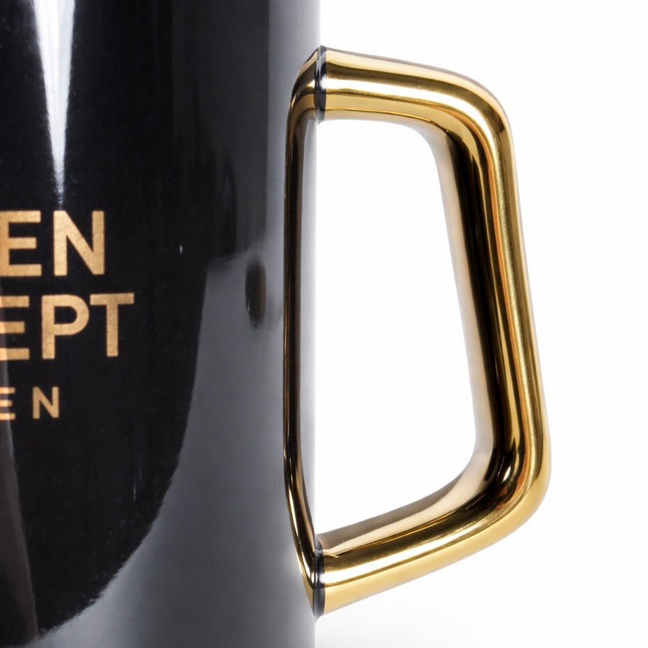 マグカップの取手部分は、ゴールドカラー仕上げとなっており、さりげないアクセントを添えています。