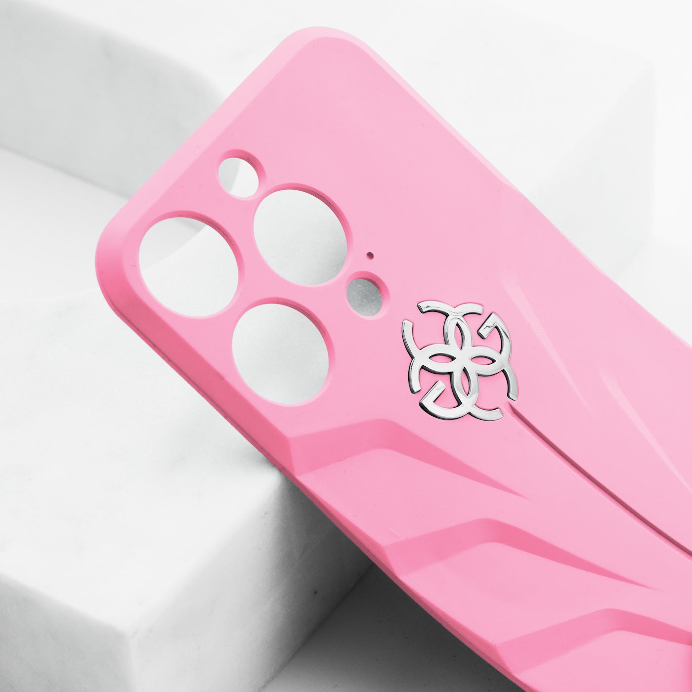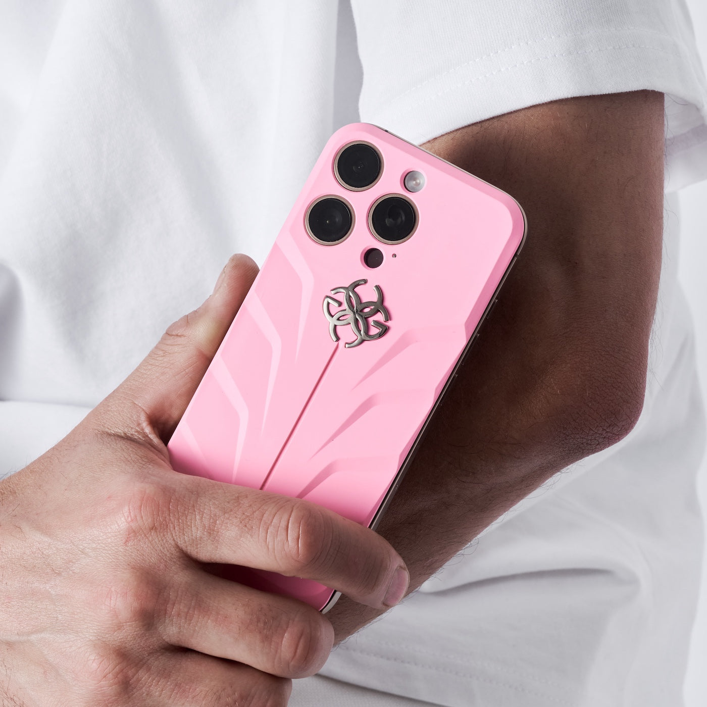 ケース中央には、精密でエレガントに作られたゴールデンコンセプトのシンボルロゴがあしらわれています。この繊細でありながら印象的なディテールが、ケースのダイナミックなデザインを引き立て、ブランドの品質と卓越した職人技へのこだわりを見事に表現しています。