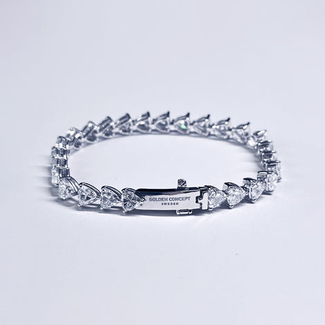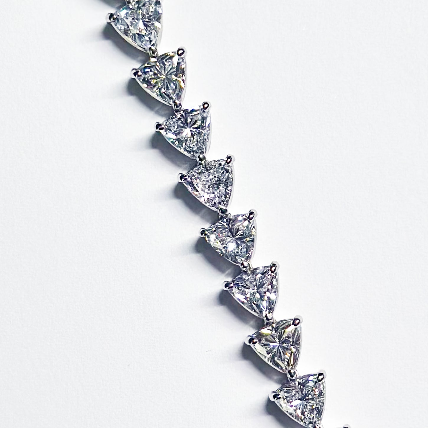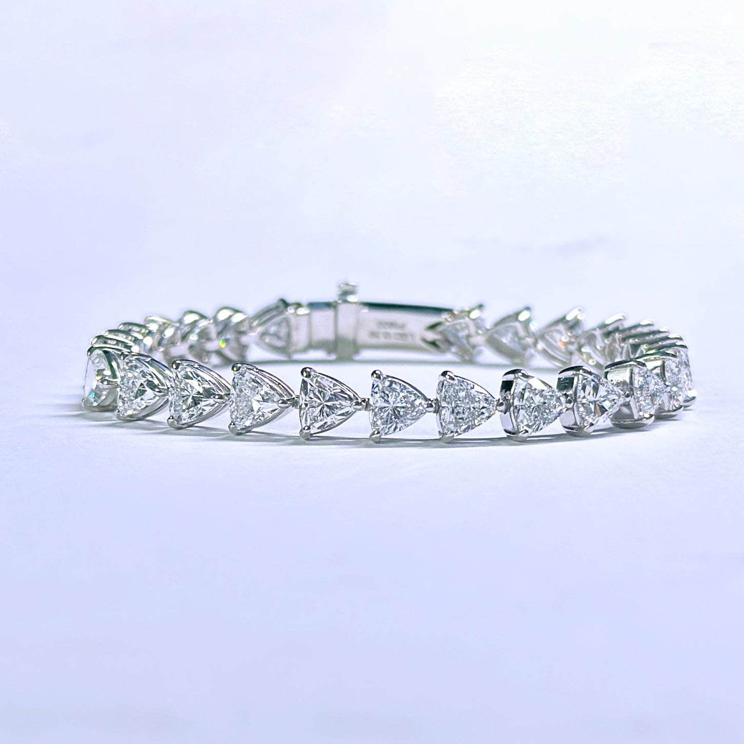 連なるトリリアントカットのラボグロウンダイヤモンドが、手元に気品ある輝きを添えるテニスブレスレット。合計13.39カラットの贅沢なボリュームをプラチナ(Pt900)がしっかりと支え、澄んだ煌めきを引き立てます。クラシックなフォルムにモダンな感性を映した、タイムレスな一本です。