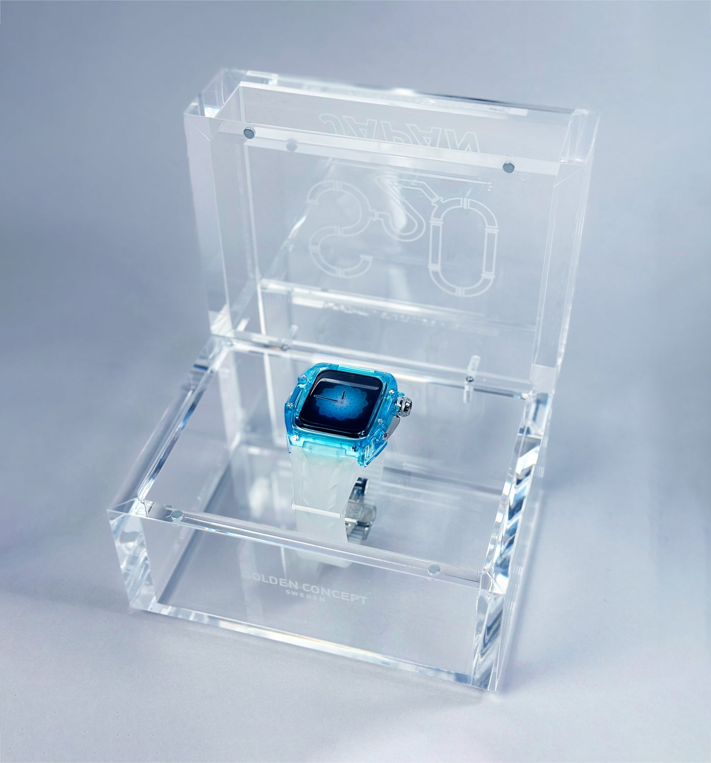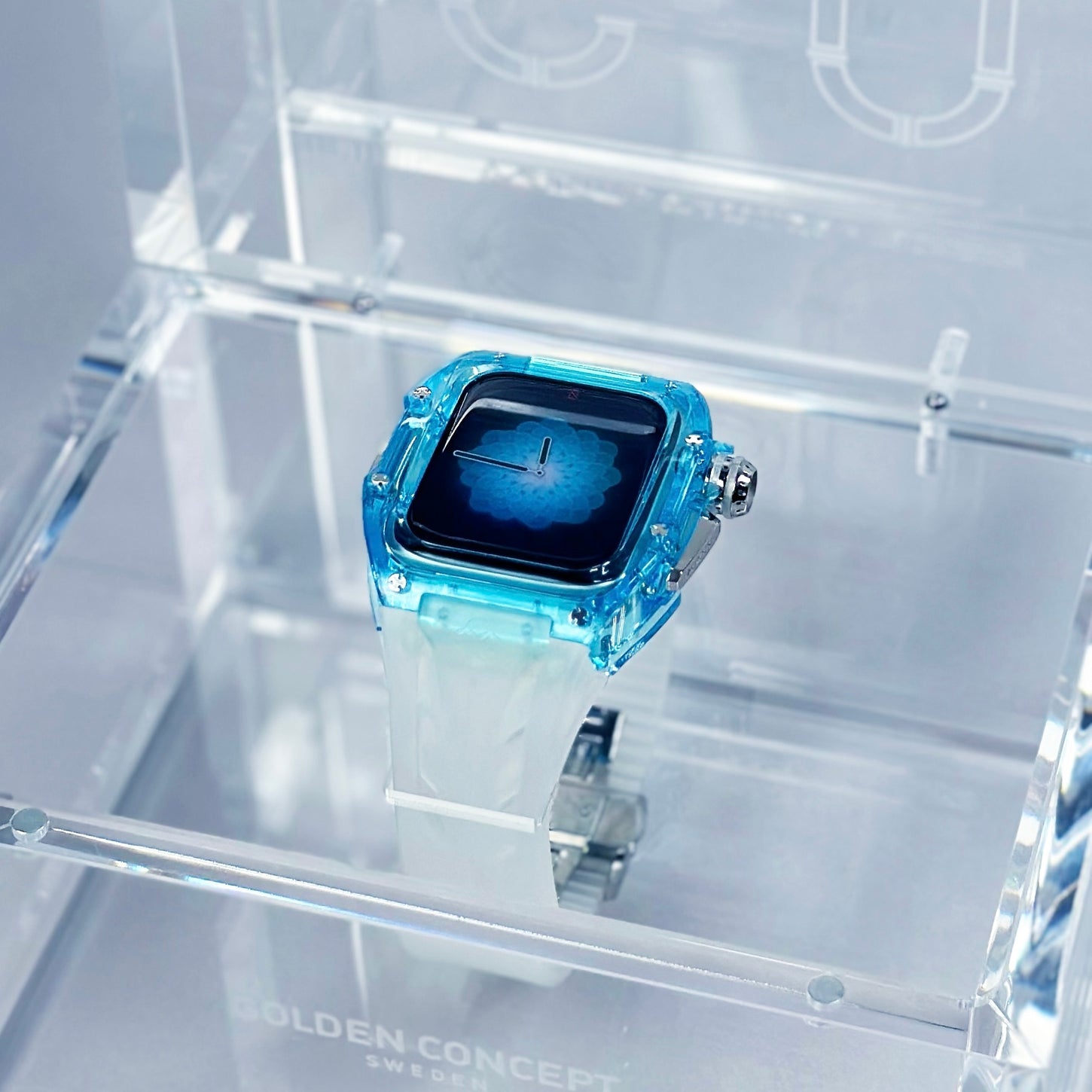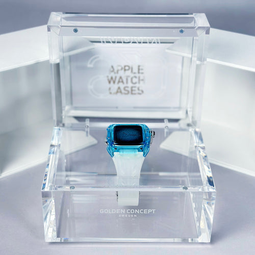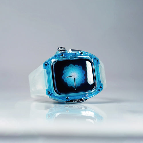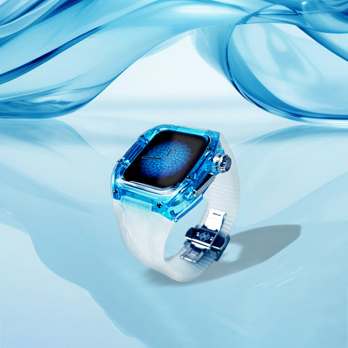 この透き通るような透明感のあるデザインは、耐久性と耐摩耗性に優れたナイロン素材によって実現されています。爽やかなサファイアブルーに彩られたクリアケースと半透明ストラップが見事に調和し、その透明感と色彩は、まるで青空や水面を連想させる独創的なデザインを魅せています。