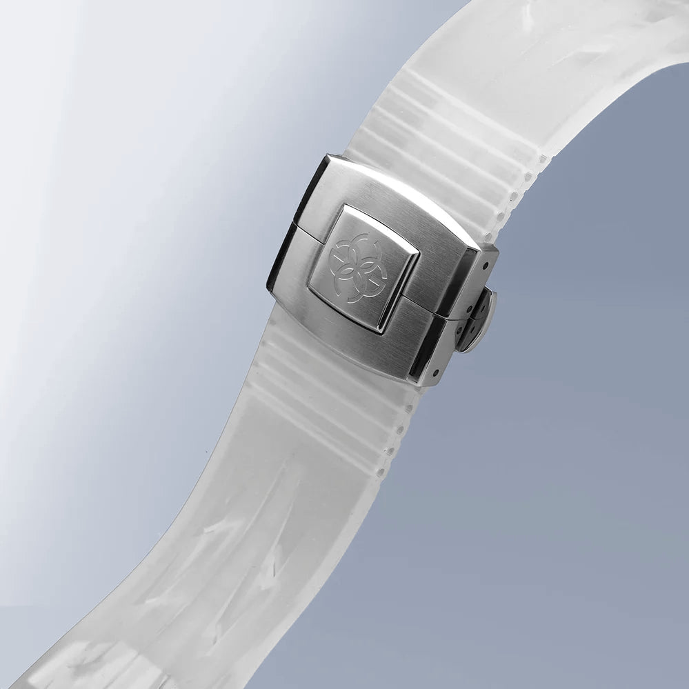 高密度の半透明シリコーンラバーで作られたこのストラップは軽量で柔軟性を持ち合わせています。透明な外観とチタン製バタフライバックルが耐久性とエレガンスを兼ね備えています。