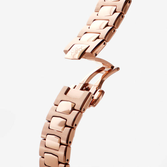 ケースとシームレスに繋がったメタルブレスレットは、裏側も丸みを持たせ、腕に触れる部分を全て曲面で構成することで、優しい着け心地に配慮しています。さらに、バタフライバックルを採用し、シンプルでなめらかな機能性も備えており、快適な装着感を提供します。
