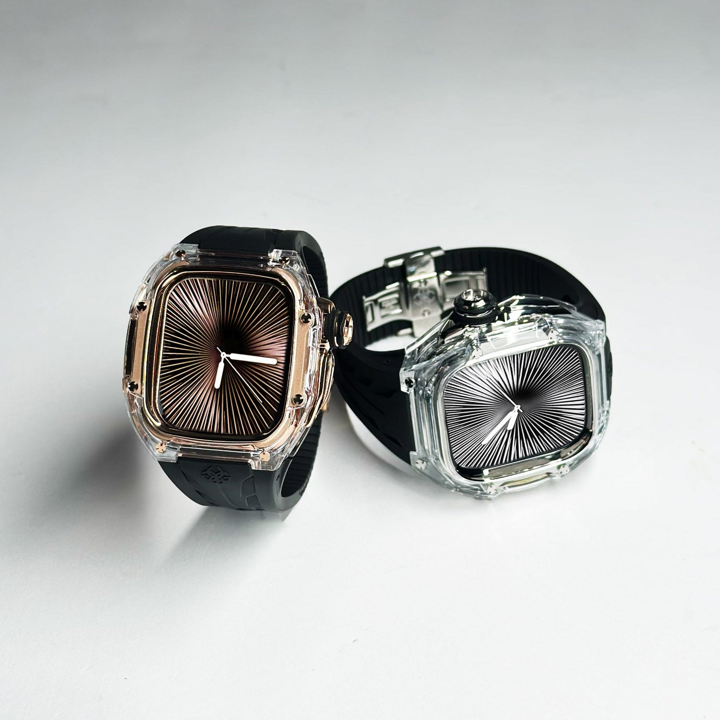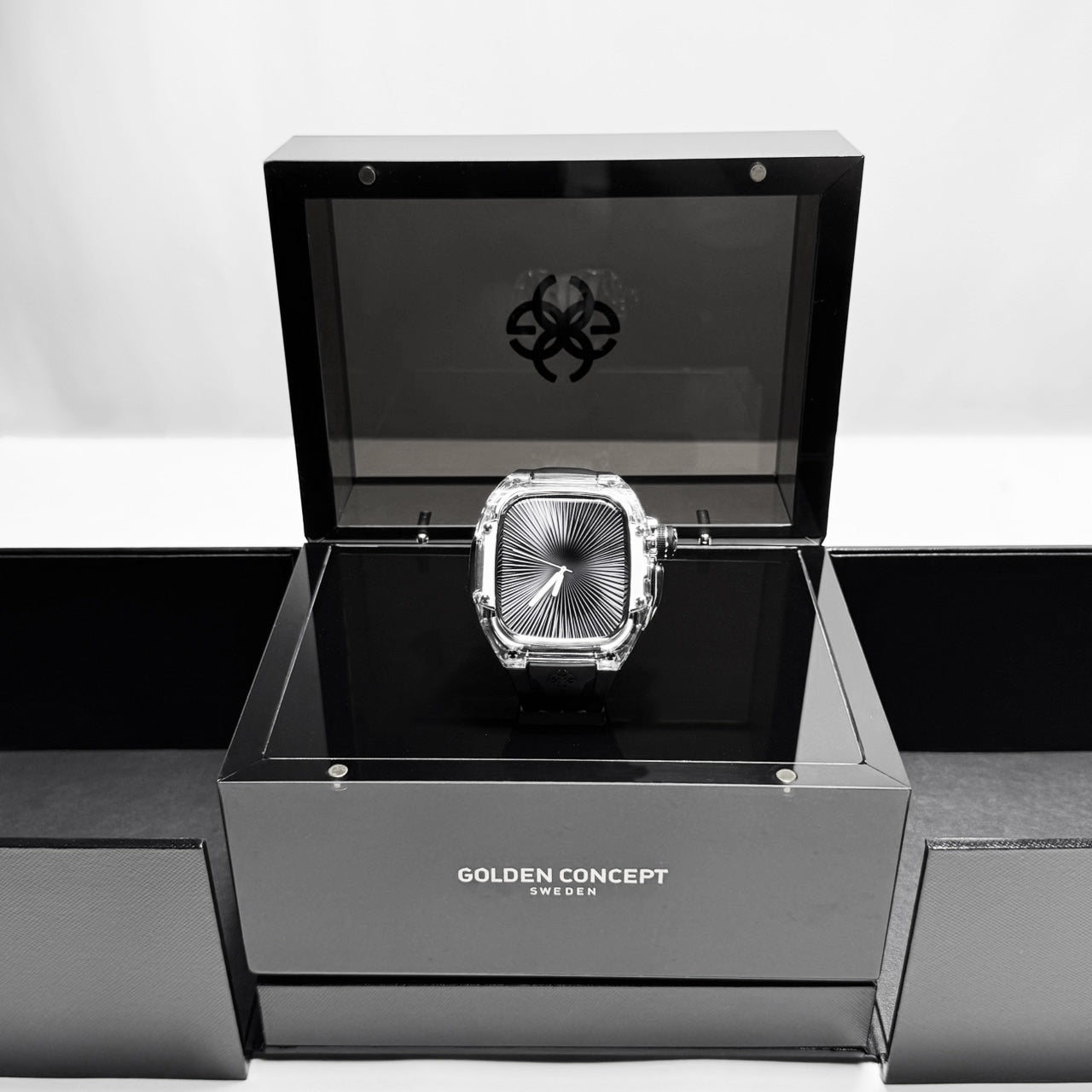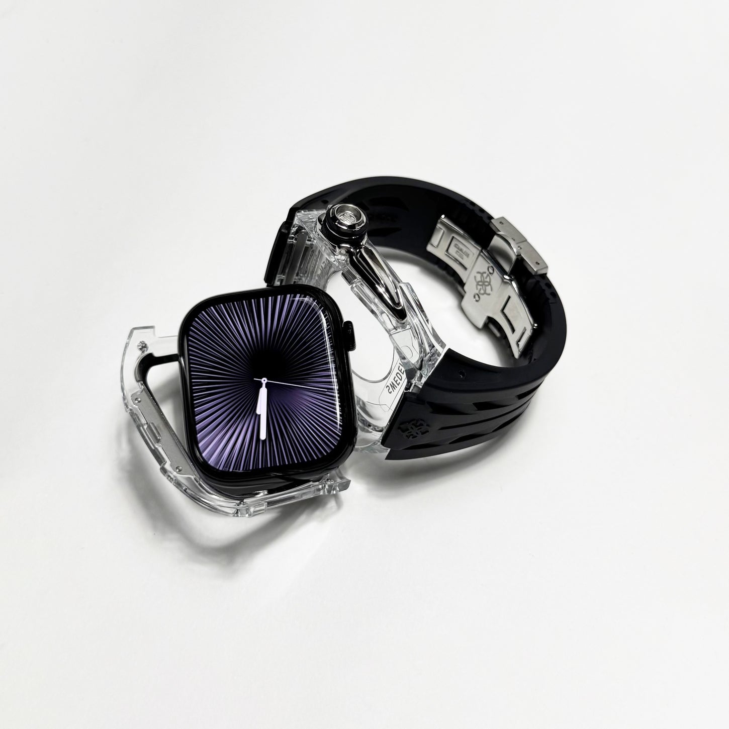 透明感のあるクリアケースにブラックストラップを組み合わせ、モダンで引き締まった印象を演出します。Apple Watch Ultra 1・2・3(49mm)および Apple Watch Series 10・11(46mm)に対応し、クリアとブラックが織りなすコントラストが、GOLDEN CONCEPTらしい高級感あふれる美しさを際立たせます。
