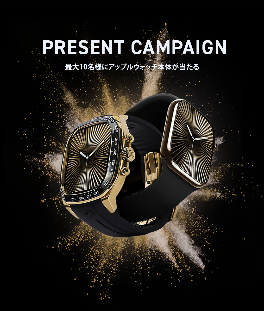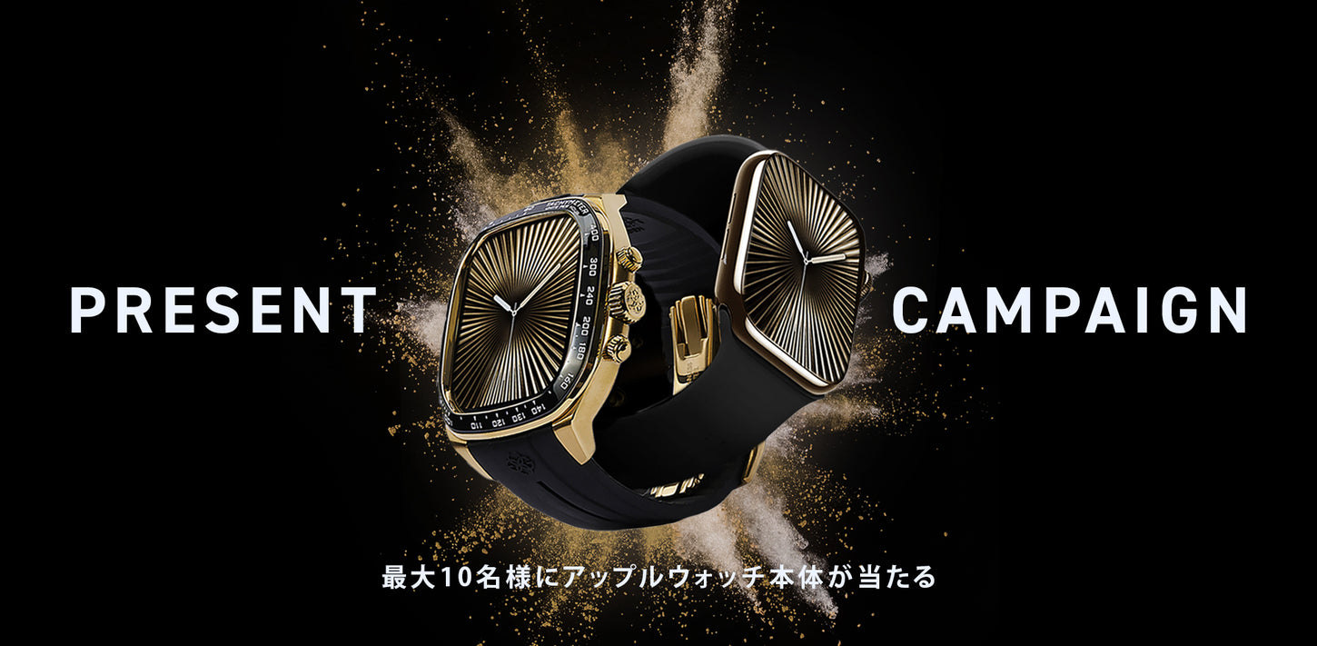ケースステンレススチール、高性能カーボンケースサイズ52,9 mm x 45,6 mm防水APPLE WATCHの防水性に準ずるケース厚16,7mmストラップラバーストラップ、展開式バックル重量55グラム (ケース重量/Apple Watch本体含まない)