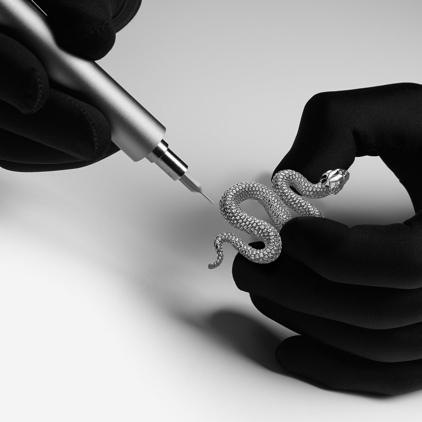 最上級のジュエリーに匹敵する精緻な蛇のデザイン。各ケースは職人の熟練の技によって精密に作り上げられ、真のクラフトマンシップと細部へのこだわりが感じられる仕上がりです。
