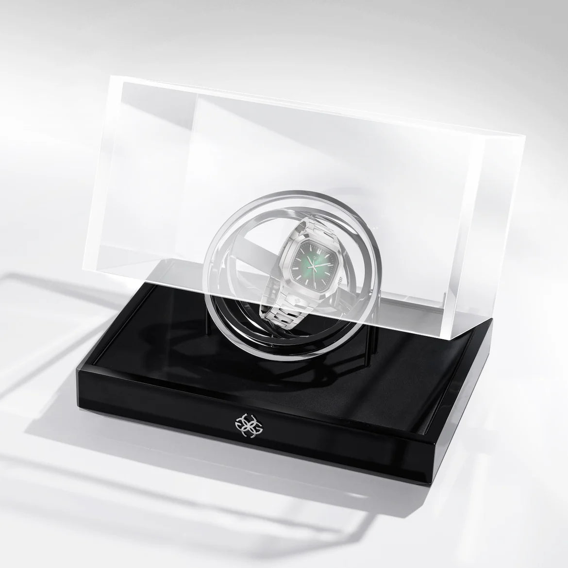 すべてのタイムピースには専用のワインダーが付属します。ワインダーは美しい軌道を描く静かな回転によってムーブメントをゆっくりと動かし続け、時計がいつでも正確に動き出せる状態を保ちます。透明感のあるクリアパネルと建築的なラインで構成されたデザインは、日常空間に静かな存在感をもたらすインテリアオブジェとしても機能します。時計が“動き、映り、そこにある”ための特別な場所をつくり出すワインダーです。