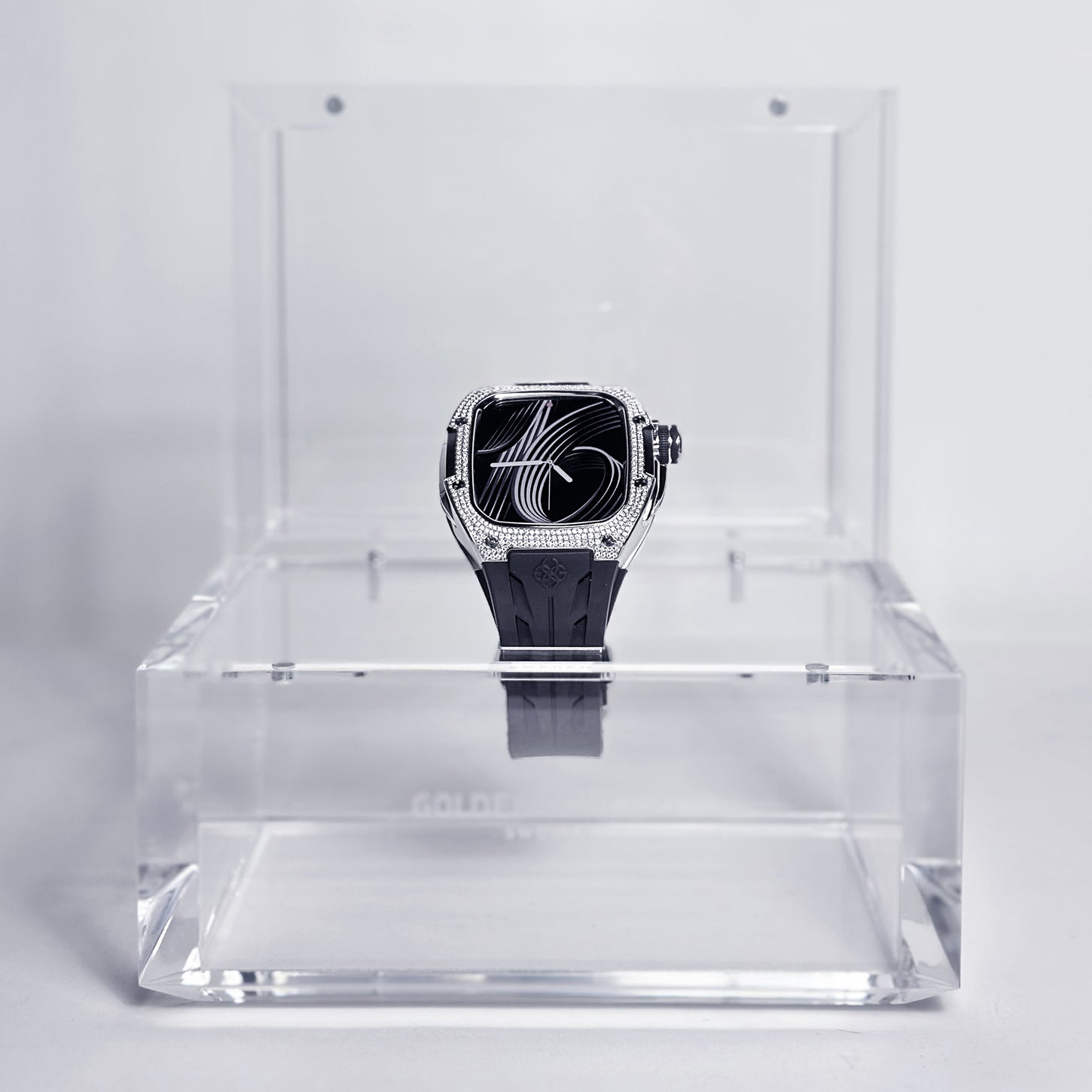 モアサナイトを丁寧にセッティングしたベゼルが、深みのあるブラックストラップと響き合い、静かで上質な存在感を生み出します。SNOW FLAKEの透明感を受け継ぎつつ、ブラックに仕上げることで、洗練された表情をまといました。