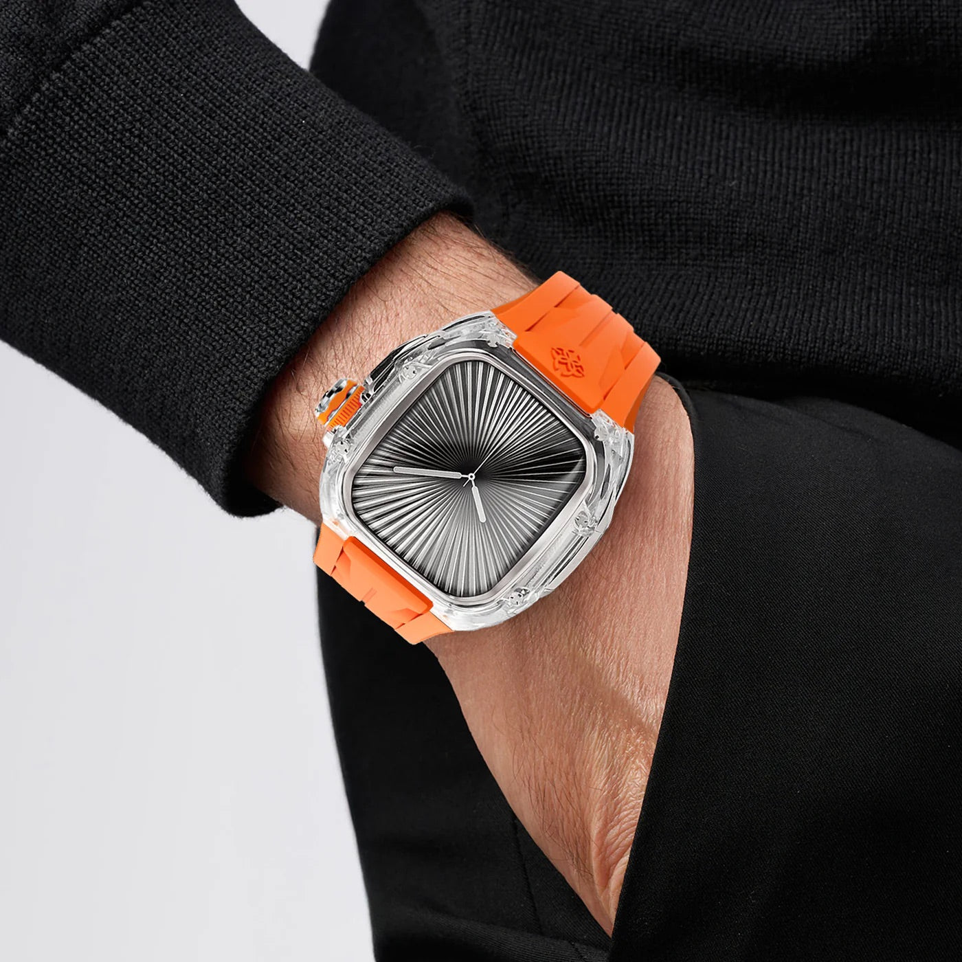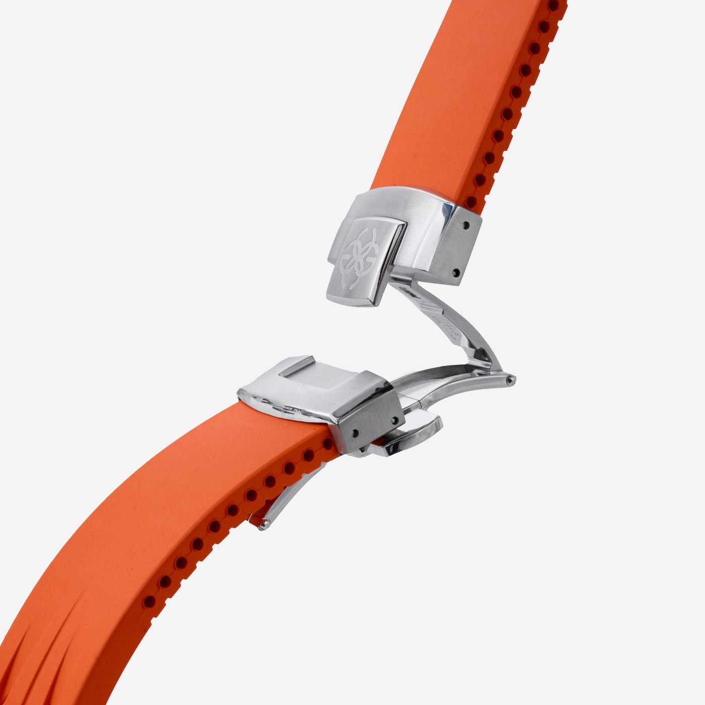 高耐久のフルオロエラストマーストラップに、ポリッシュ仕上げのスチールクラスプを組み合わせた本モデルは、快適な着用感と鮮やかなカラー、そして簡単なストラップ交換をひとつに融合させた、機能美あふれる一本です。