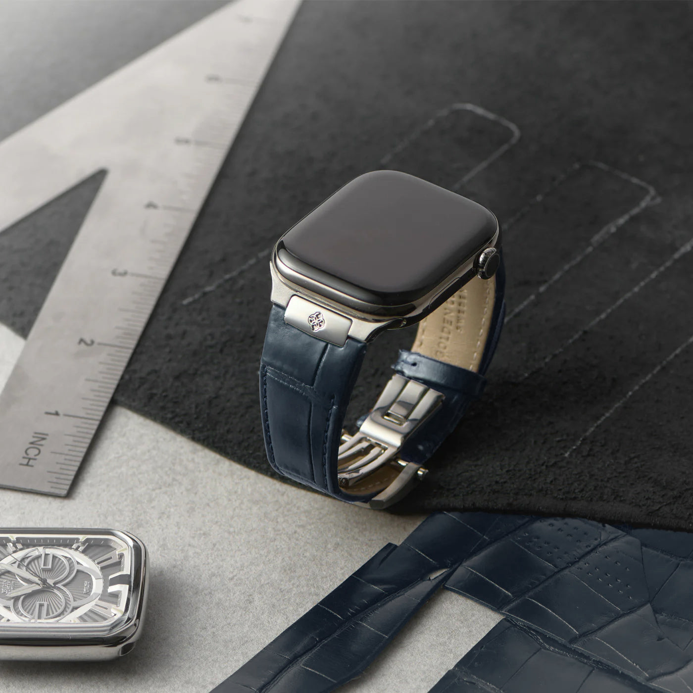 本物のアリゲーターレザーを上質に使用した『ALG Leather』で、Apple Watchを一層格上げ。クラシックなブラック、ブルー、ブラウン、グリーンの4色をご用意しました。美しい鱗模様が織り成す独特の風合いと、卓越した耐久性が手元に洗練された高級感をもたらし、使い込むほどに深みを増す魅力をお楽しみいただけます。