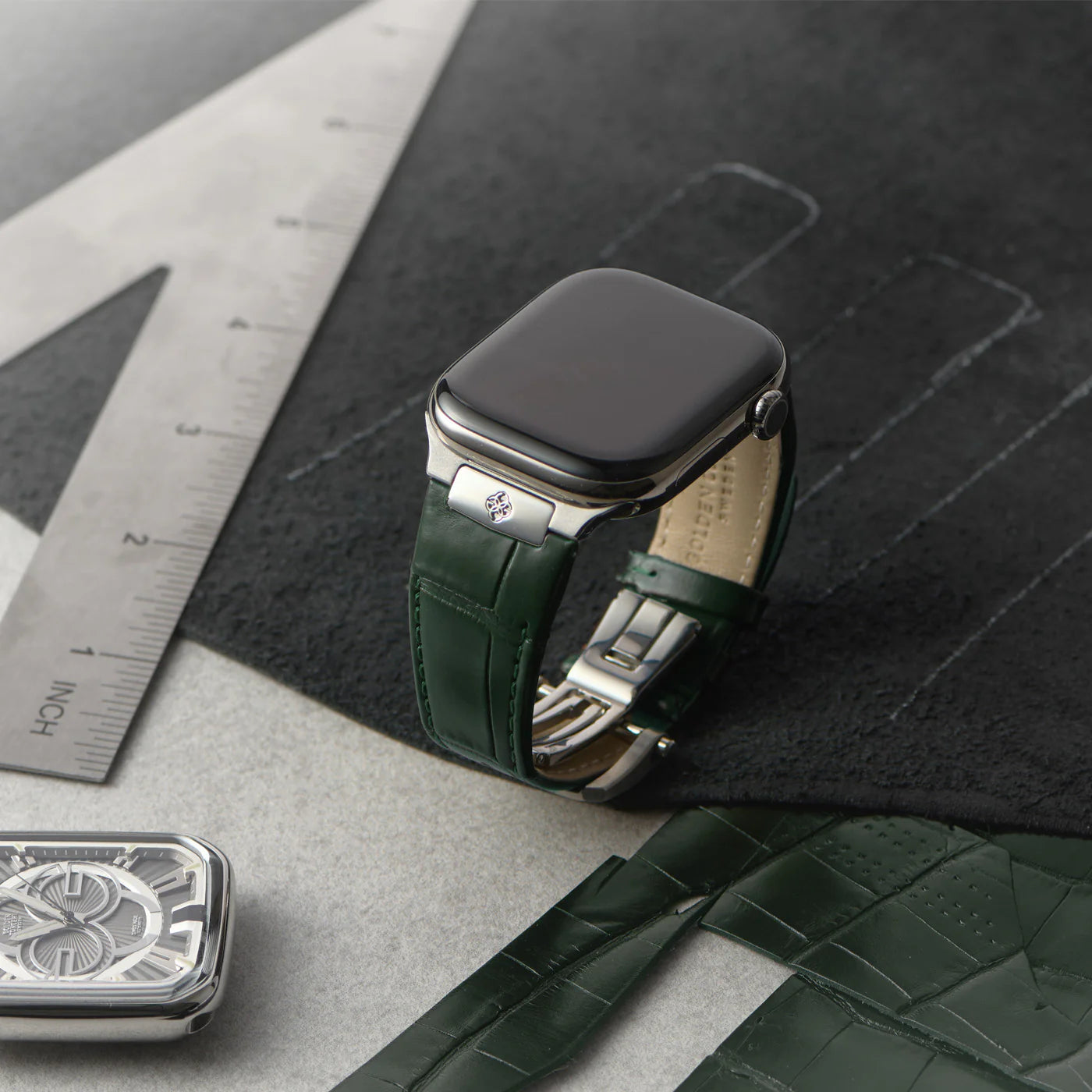 アリゲーターレザー Apple Watch ストラップは、時を超えたラグジュアリーと現代的なスタイルが融合した逸品です。ミシシッピの名高い湿地帯から採取された本物のアリゲーター革を使用し、エレガンスと耐久性を兼ね備えたストラップに仕上げました。