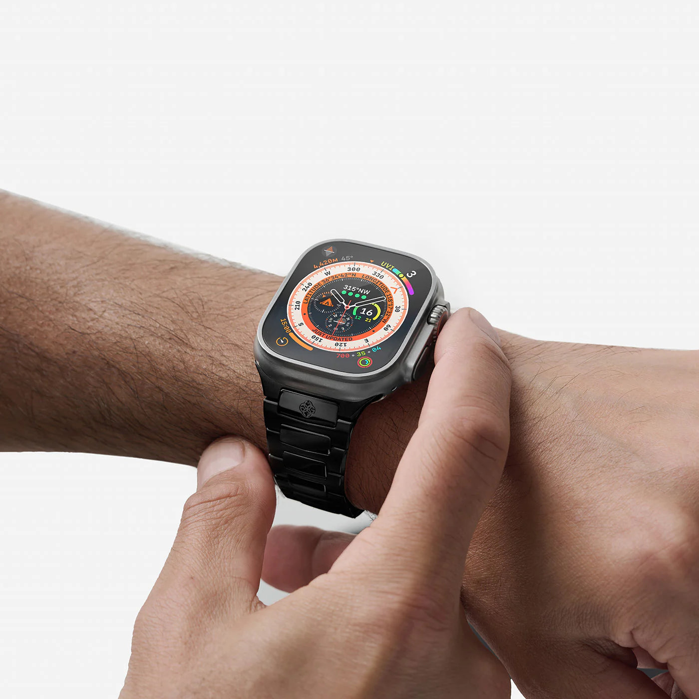 カラーバリエーションは、チタニウムグレー、ブラック、シルバーの3色展開。ストラップはアップルウォッチ45mm、49mmどちらのサイズにも完璧にフィットするように設計されており、多彩なスタイルをお楽しみいただけます。