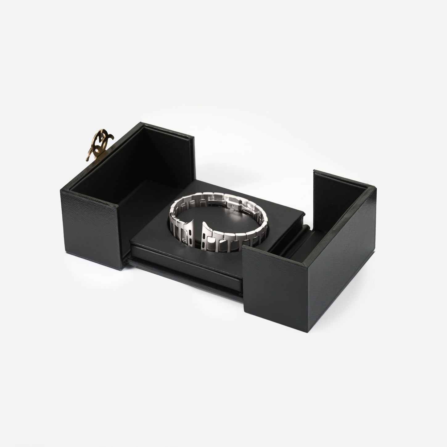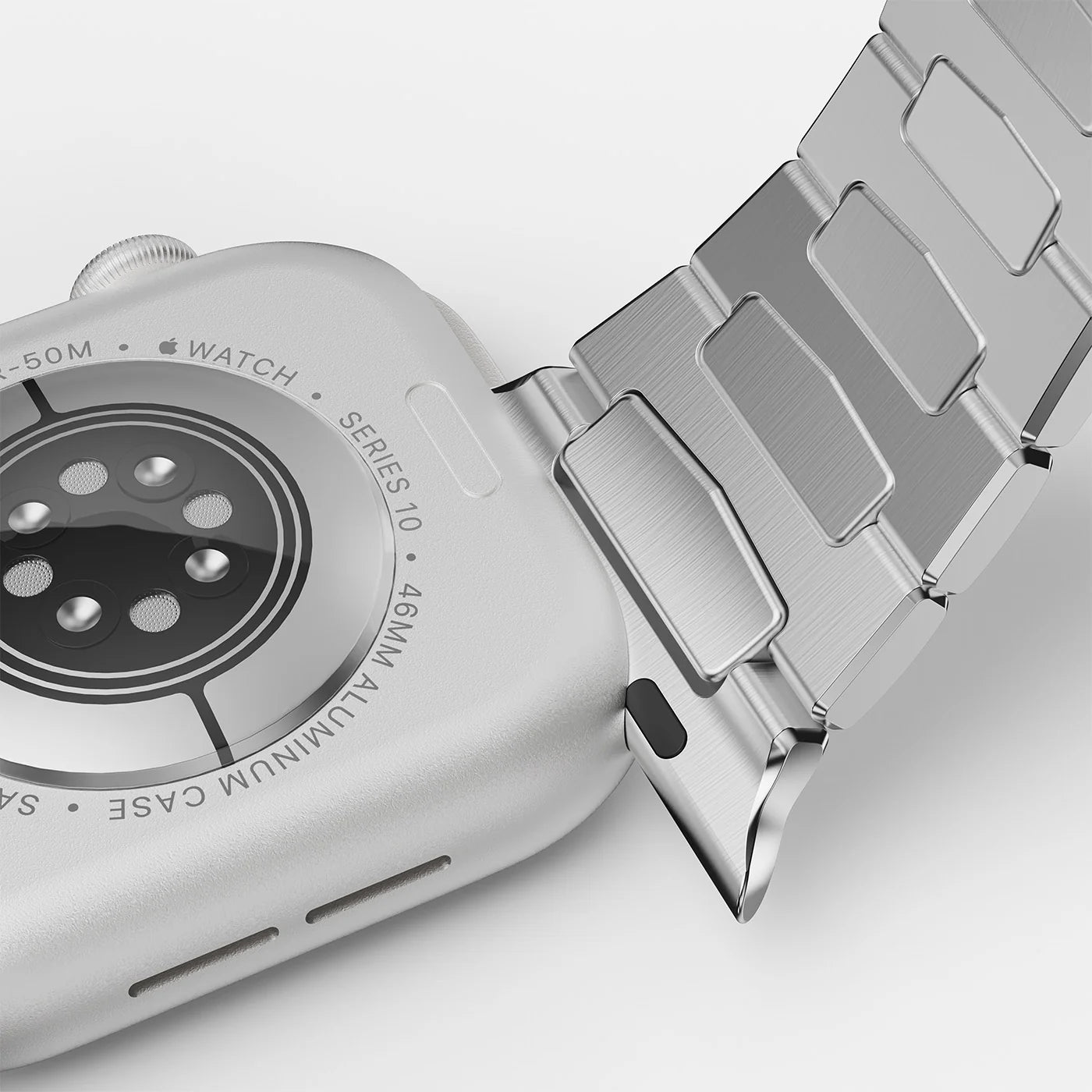 ストラップはアップルウォッチ45mm、49mmどちらのサイズにも完璧にフィットするように設計されており、日常からフォーマルな場面まで幅広いシーンに対応します。洗練されたデザインが、Apple Watchを単なるデバイスから、存在感あふれるステートメントピースへと昇華させます。