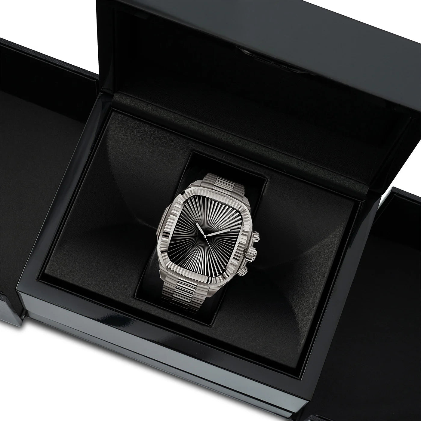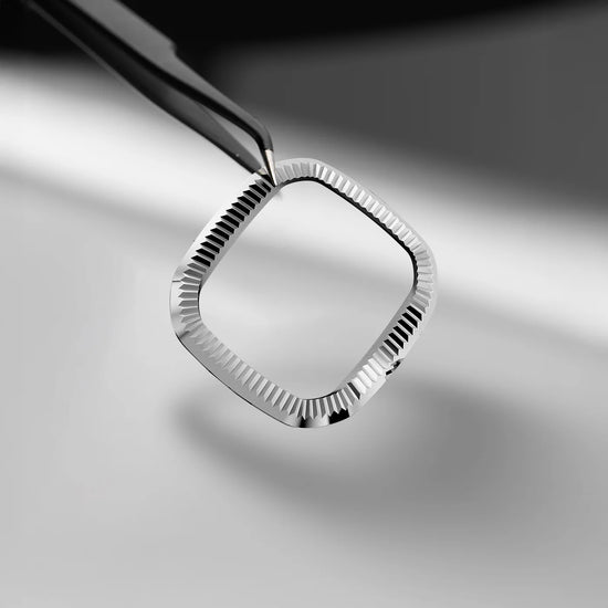 316Lステンレススチール製の高品質ベゼルを採用。リブデザインが光を美しく反射し、見る角度によって異なる表情を楽しめます。繊細で洗練された仕上がりが、ケース全体に上質な質感と芸術的な魅力を与えています。