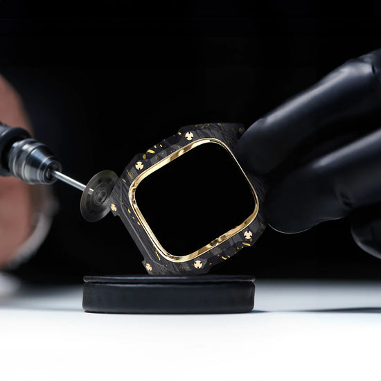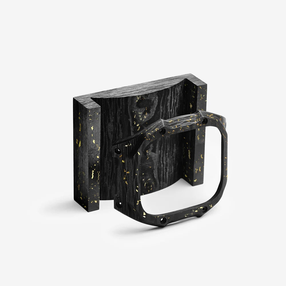 この特徴的なケースデザインは、カーボンファイバーと金属片を混ぜ合わせ何層にも重ねることで独創的な模様を生んでいます。さらに金属片を混ぜ合わせる事でゴールドがアクセントとなったユニークな外観と、高い耐久力を両立しています。
