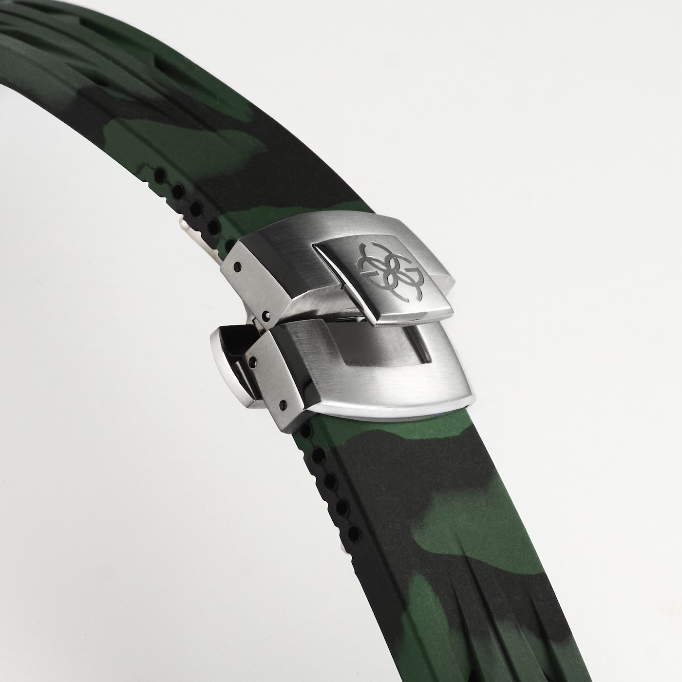 カモフラージュストラップには、開閉しやすくしっかりと固定できるバタフライタイプのデプロイメントクラスプを採用しています。ケースに合わせたシルバートーンで統一されており、装着時のフィット感を高めつつ、全体のデザインにも自然に馴染みます。