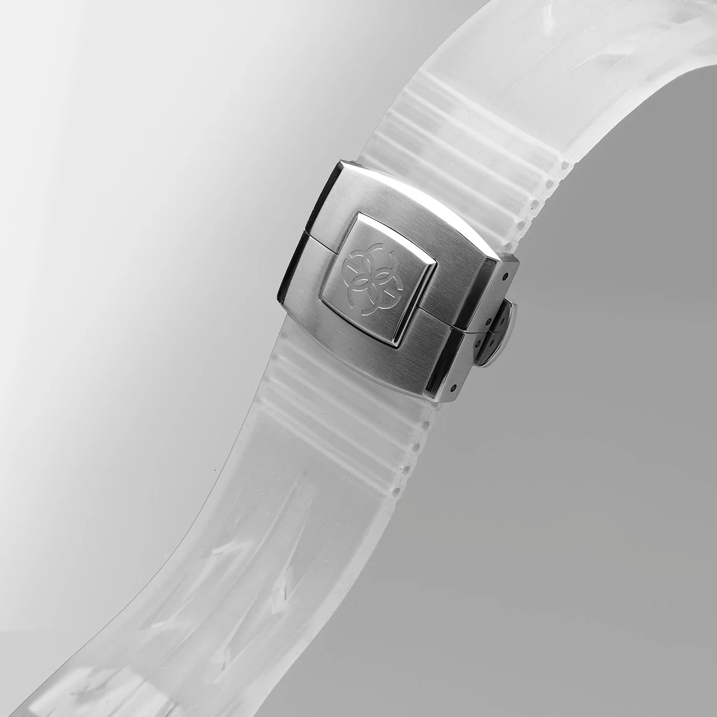 高密度の半透明シリコーンラバーで作られたこのストラップは軽量で柔軟性を持ち合わせています。透明な外観とチタン製バタフライバックルが耐久性とエレガンスを兼ね備えています。「スナップオンストラップ」を搭載しているため、着脱も簡単に行えます。