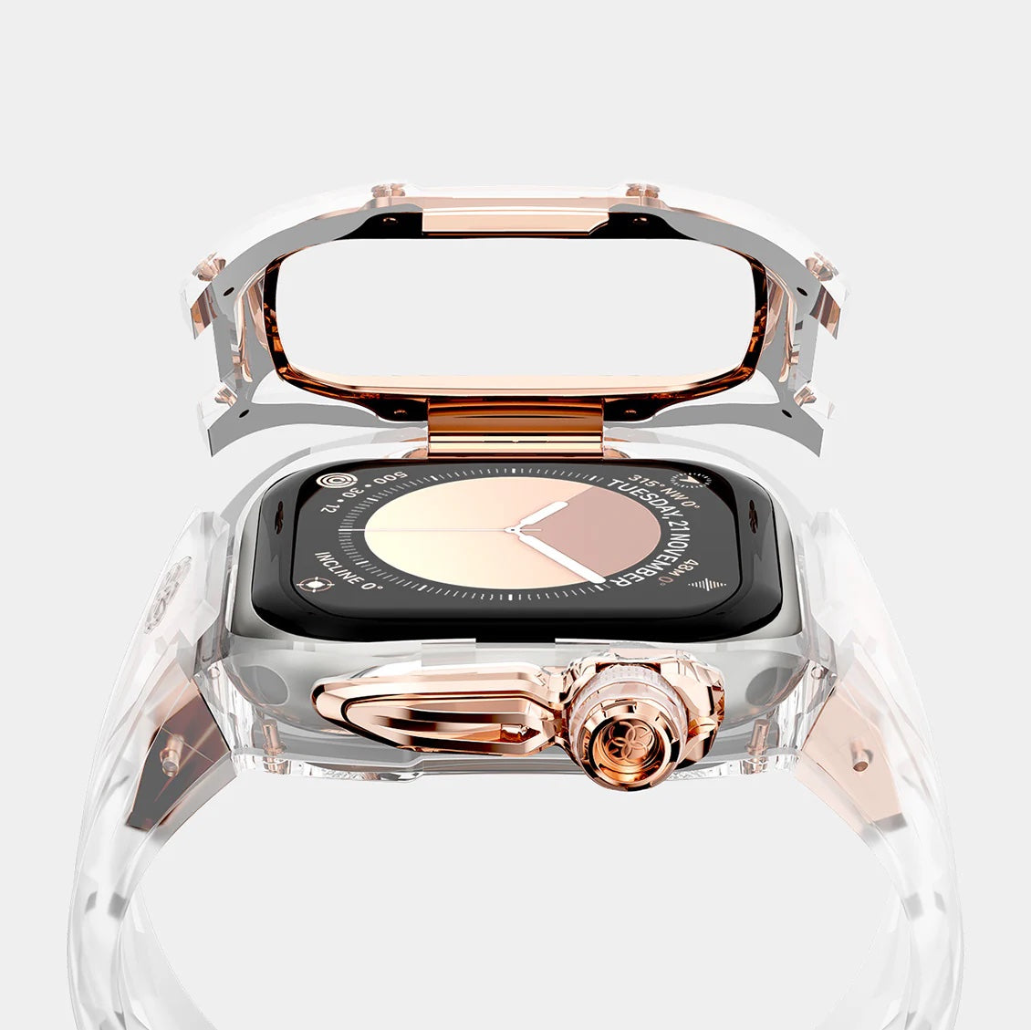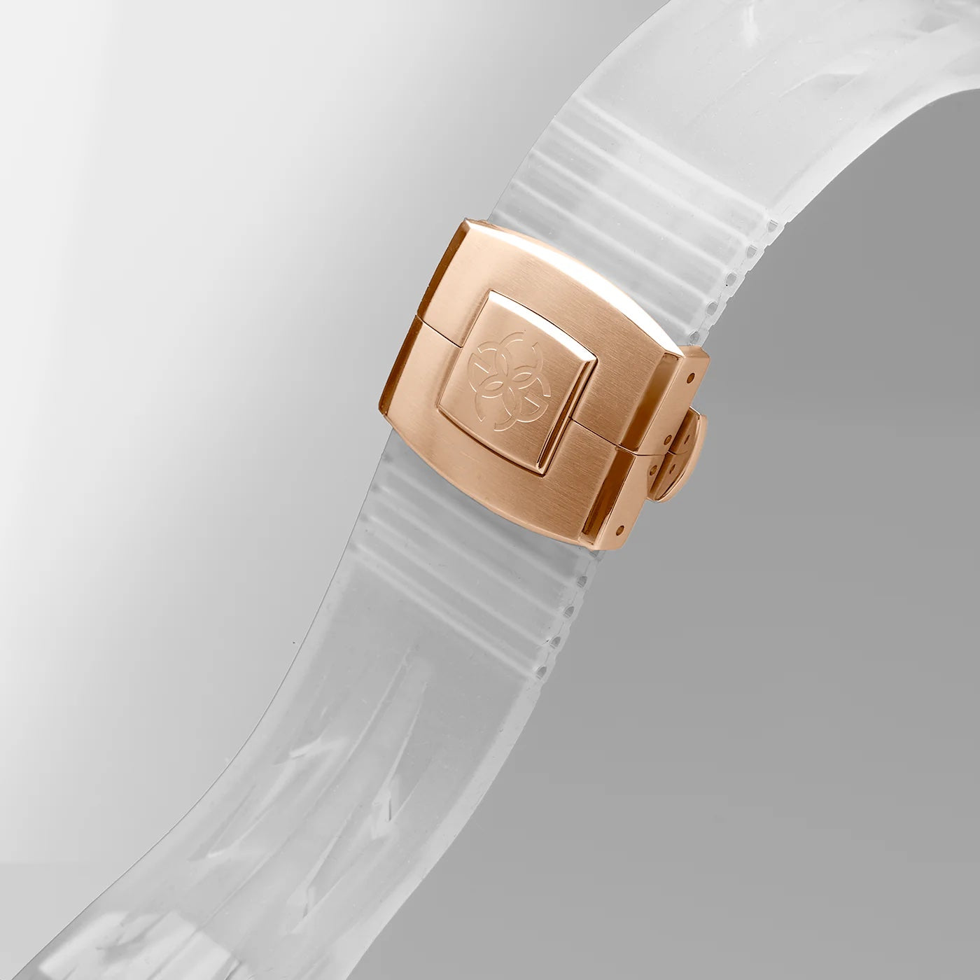 高密度の半透明シリコーンラバーで作られたこのストラップは軽量で柔軟性を持ち合わせています。透明な外観とチタン製バタフライバックルが耐久性とエレガンスを兼ね備えています。「スナップオンストラップ」を搭載しているため、着脱も簡単に行えます。