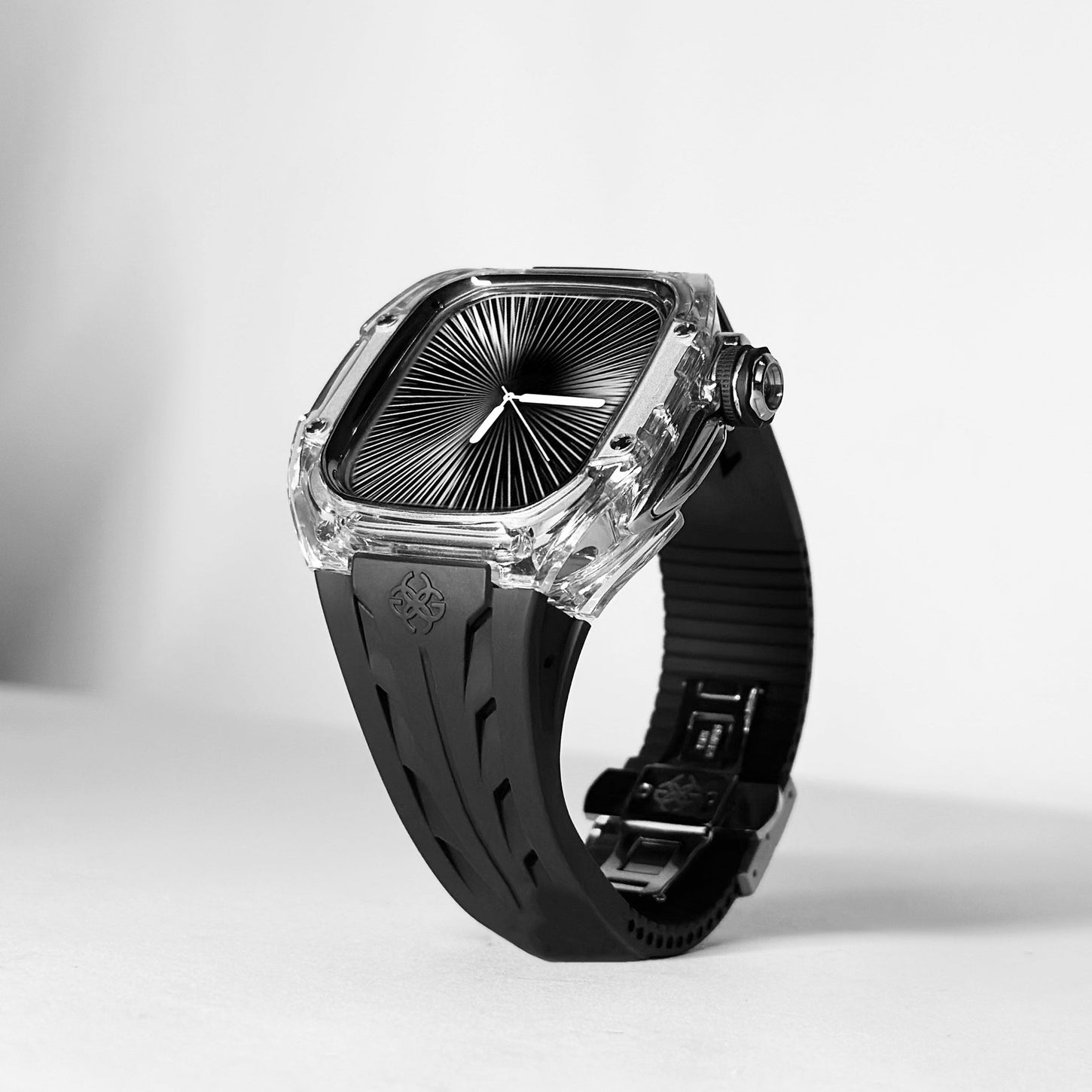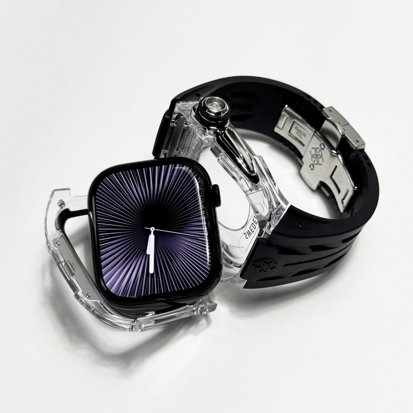 高密度の半透明シリコーンラバーで作られたこのストラップは軽量で柔軟性を持ち合わせています。透明な外観とチタン製バタフライバックルが耐久性とエレガンスを兼ね備えています。「スナップオンストラップ」を搭載しているため、着脱も簡単に行えます。