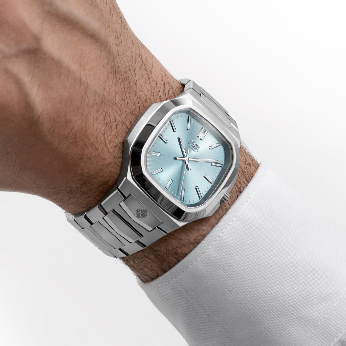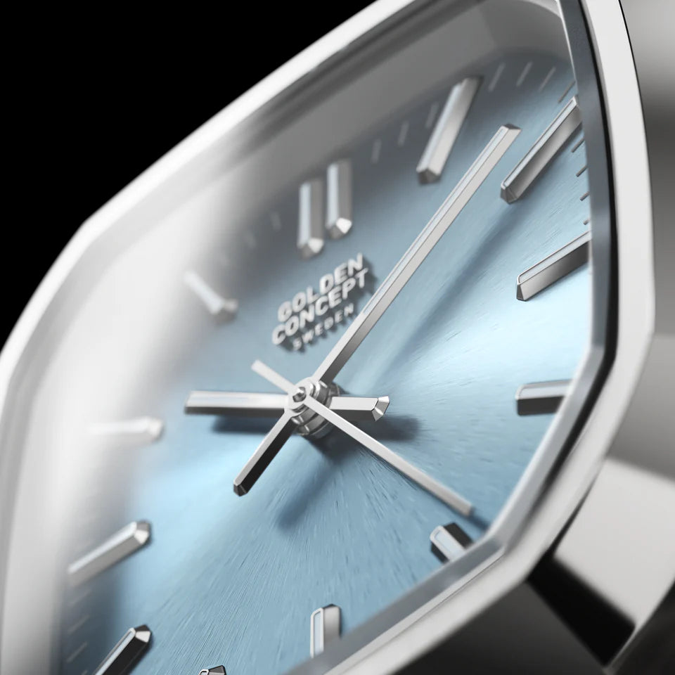Sierra Blue のダイヤルは、時計の動きに合わせてほんのりと表情を変える、澄んだエネルギーを宿しています。サンバースト仕上げが淡いブルーの色調を引き立て、表面に“静かな動き”を感じさせるような輝きが生まれます。立体的に面取りされたインデックスは、光を受けて明るさを添え、涼やかでモダン、そして控えめながら確かな存在感を持ったダイヤルを完成させています。