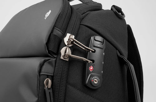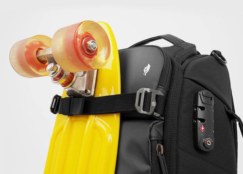 スキーやスノーボードを固定できるフックストラップと、体にしっかりフィットする各種ストラップでアクティブな動きにも対応し、トップジップや伸縮性のあるサイドポケットがスムーズな収納をサポート、さらにTSAロックを搭載することで旅先でも安心して使える、機能性に優れたバッグです。