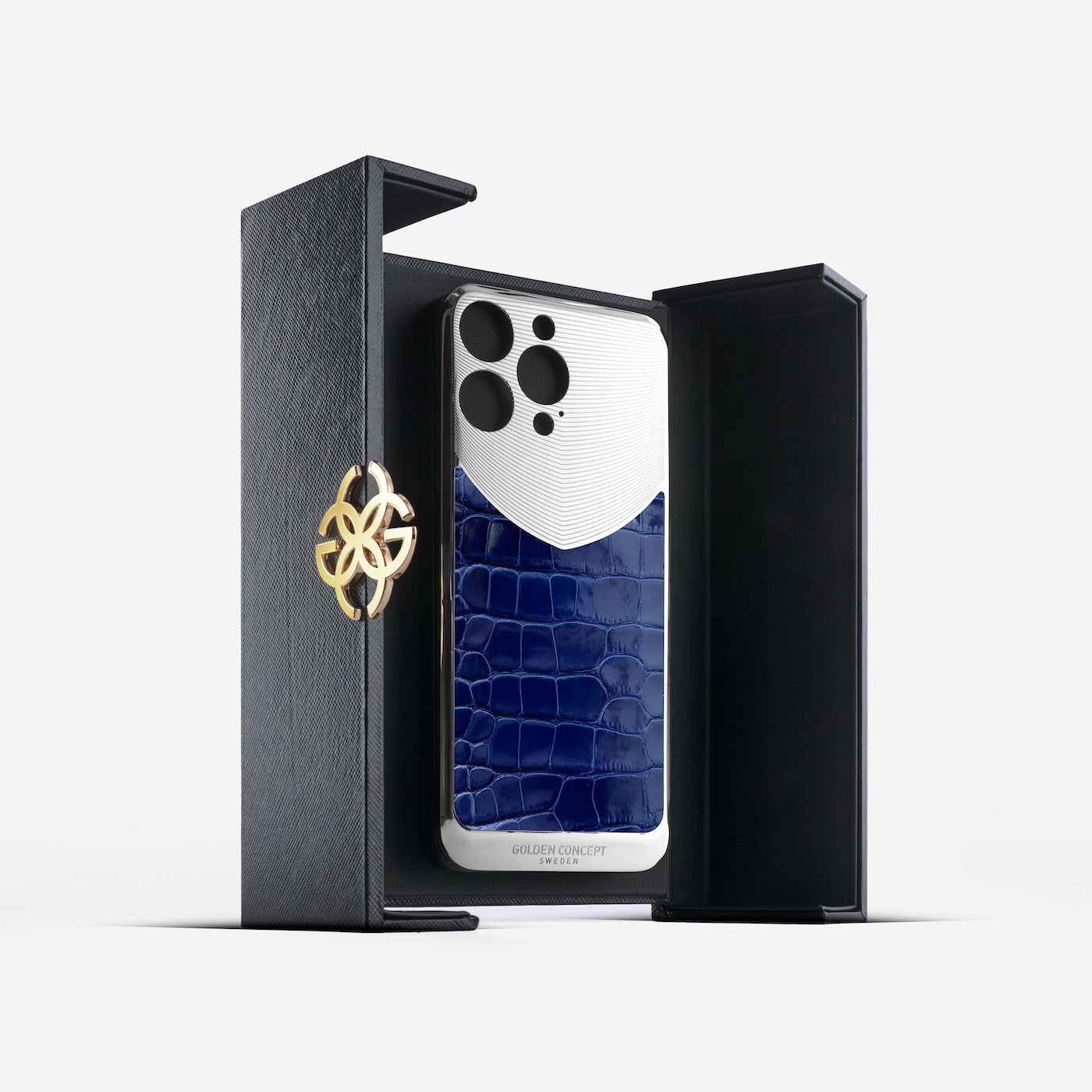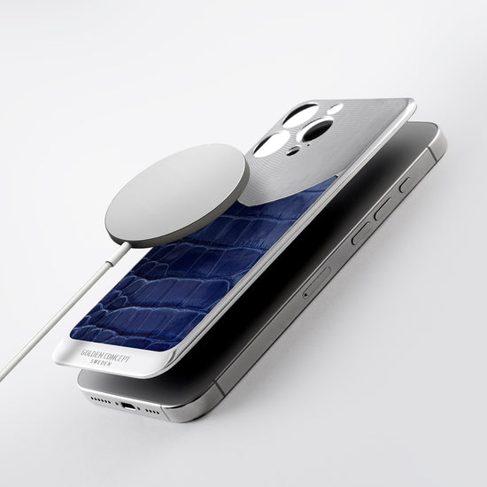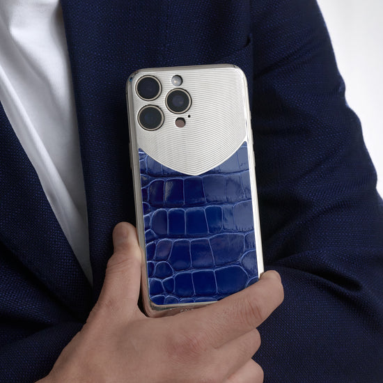 かつてない存在感を放つ、最高峰のマグネティック・シールド艶やかなブルーのアリゲーターレザーを、高光沢のステンレススチール製バックプレートに美しく組み合わせた本作。異なる質感が織りなすコントラストが、圧倒的な存在感を生み出し、iPhoneを単なるスマートフォンから、真のラグジュアリーアイテムへと昇華させます。