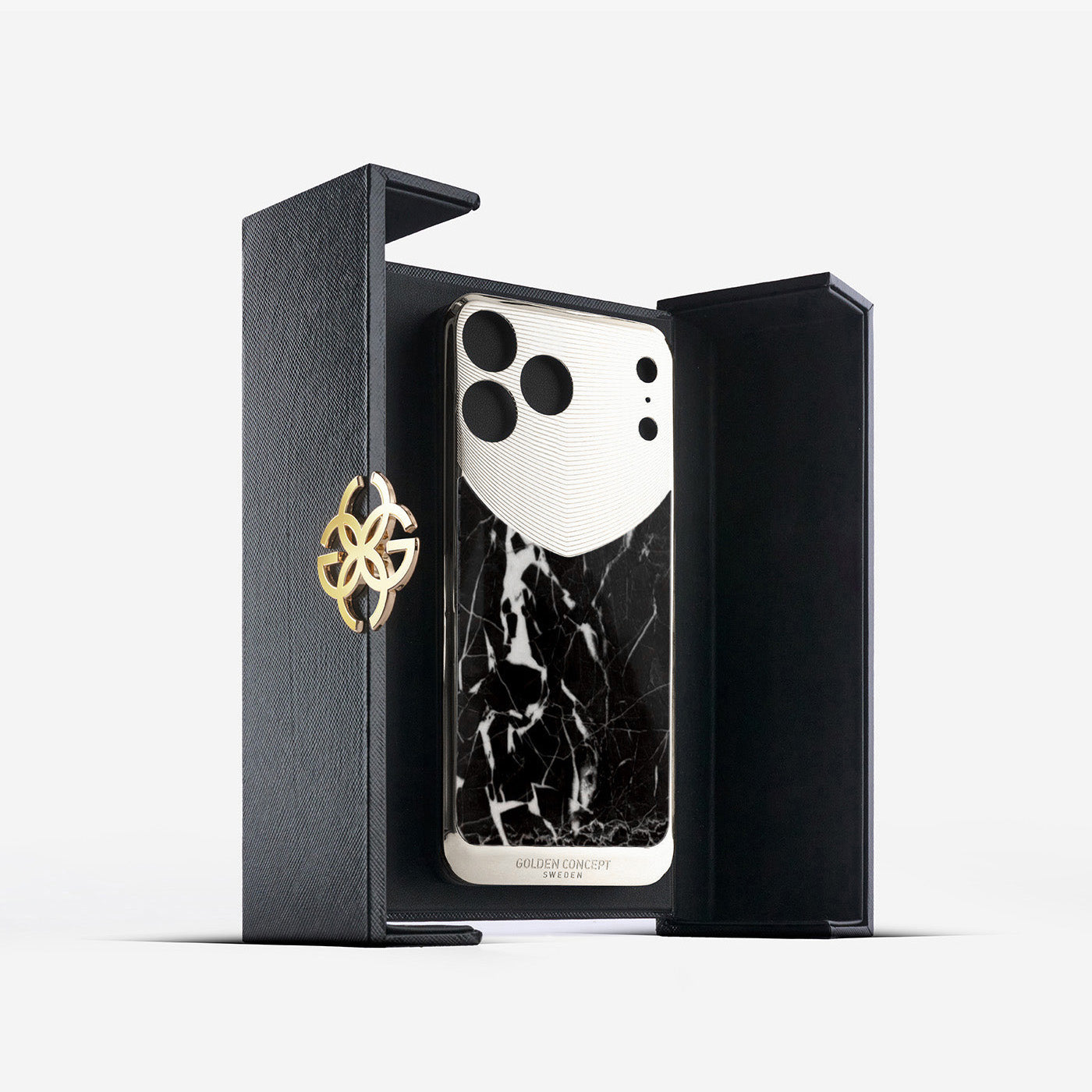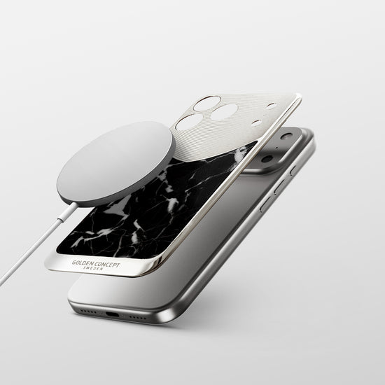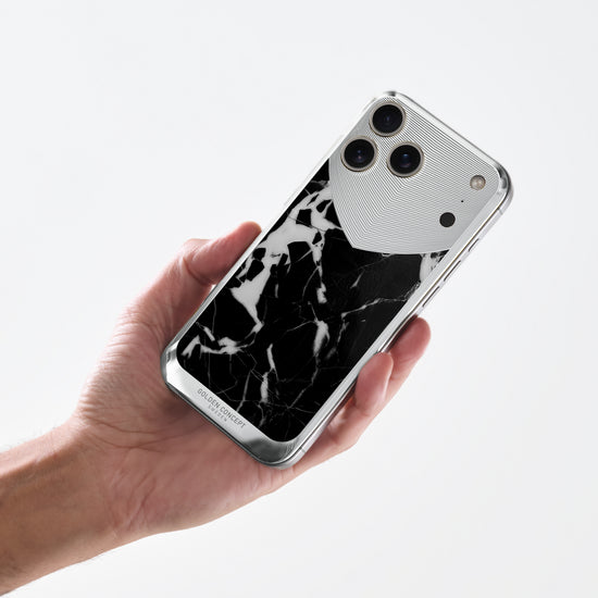 iPhone 17 Pro、Pro Max、Air 用に仕立てられた「Nero Marquina マグネティックシールド」は、深い黒色と鮮やかな白い筋模様が特徴の天然大理石を使用しています。シルバーのステンレススチール製バックプレートに美しくはめ込まれ、鮮やかなコントラストと精緻なディテールが融合し、iPhone のクリーンなフォルムに力強く印象的な表情を添えます。