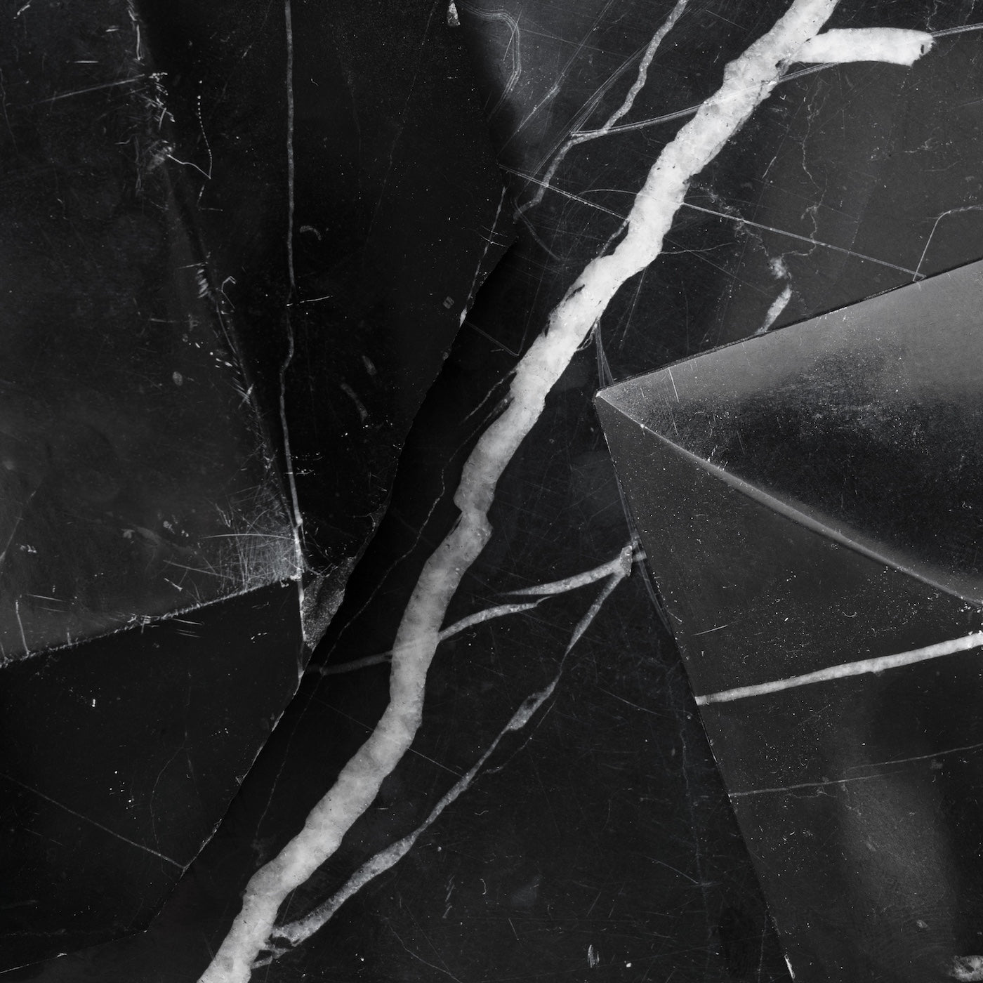 「Nero Marquina」大理石は、深い黒色と鮮やかな白い筋模様で知られています。各パネルは個別にカットされ、手作業で磨き上げられ、スチール製バックプレートに美しくはめ込まれています。同じものは二つとなく、ひとつひとつが石が語る唯一無二のストーリーを持つ作品です。