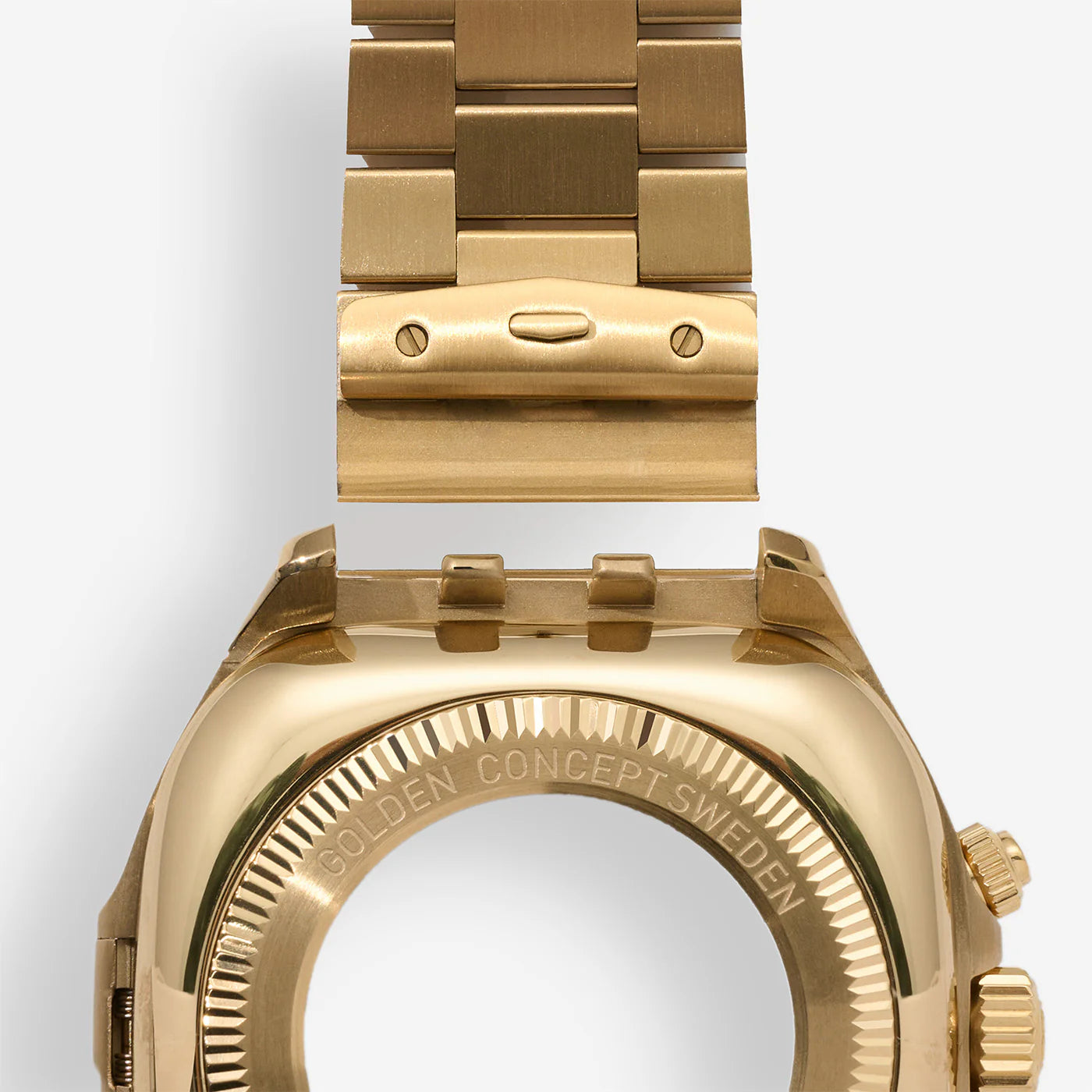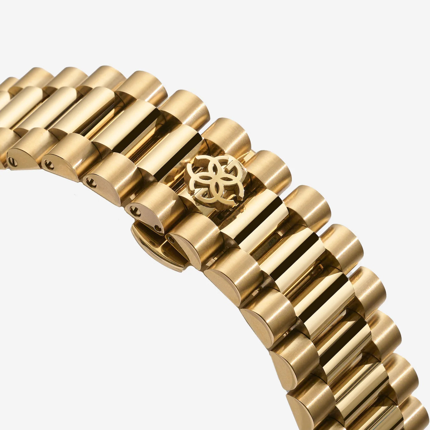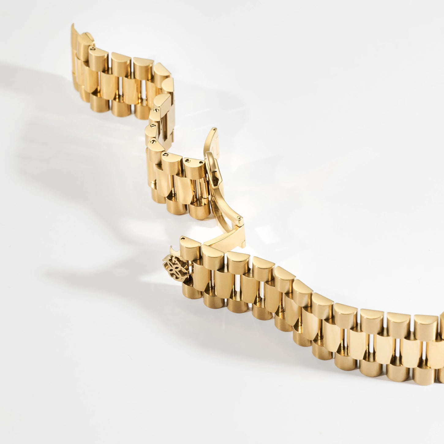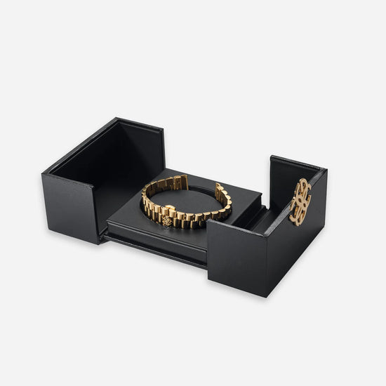 バタフライクラスプは、安定した装着感を実現するために設計され、左右対称のスムーズな2段折りで閉じます。デザインにさりげなく組み込まれた中央のリンク自体がクラスプとなり、立体的なGCエンブレムが刻まれています。この隠れた構造により、ブレスレットの美しい連続ラインを保ちつつ、控えめながらも上品なアクセントを添えています。